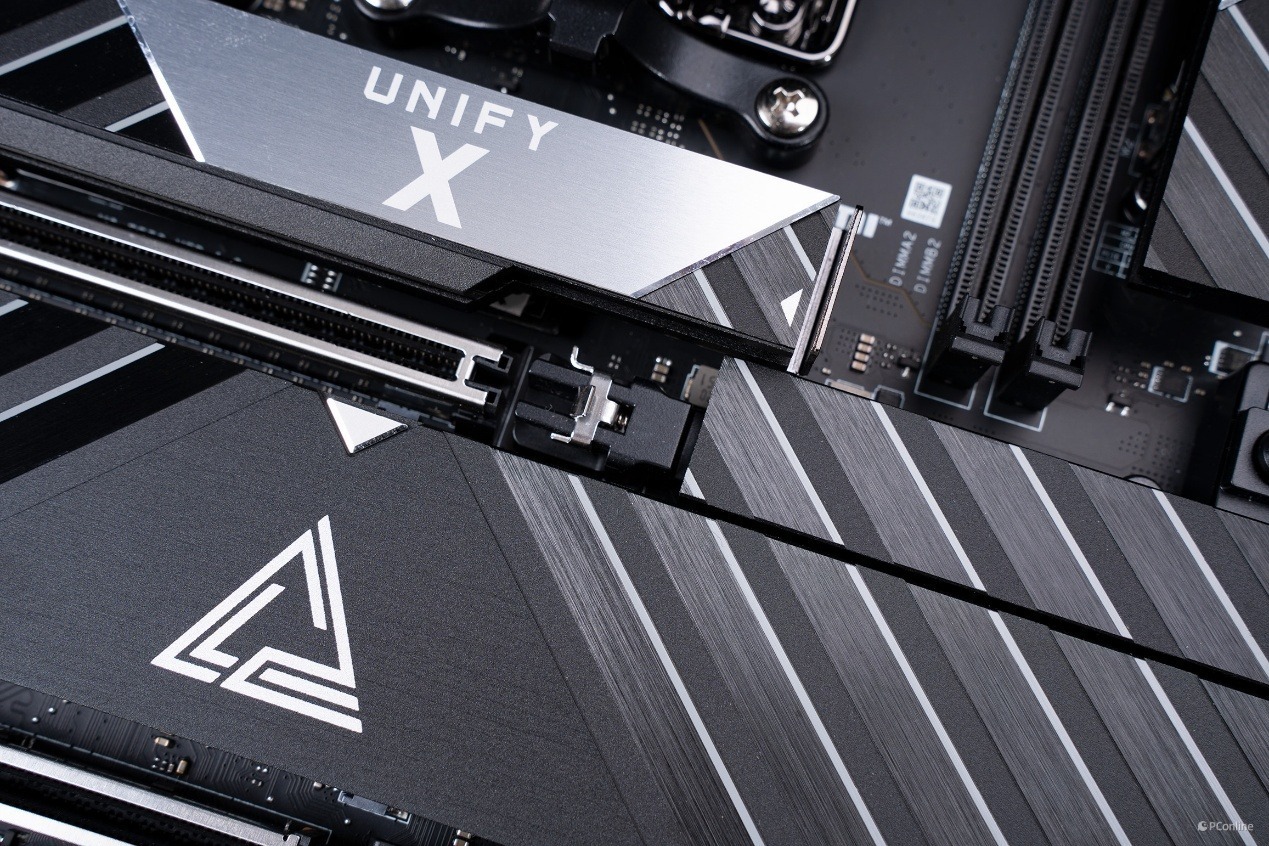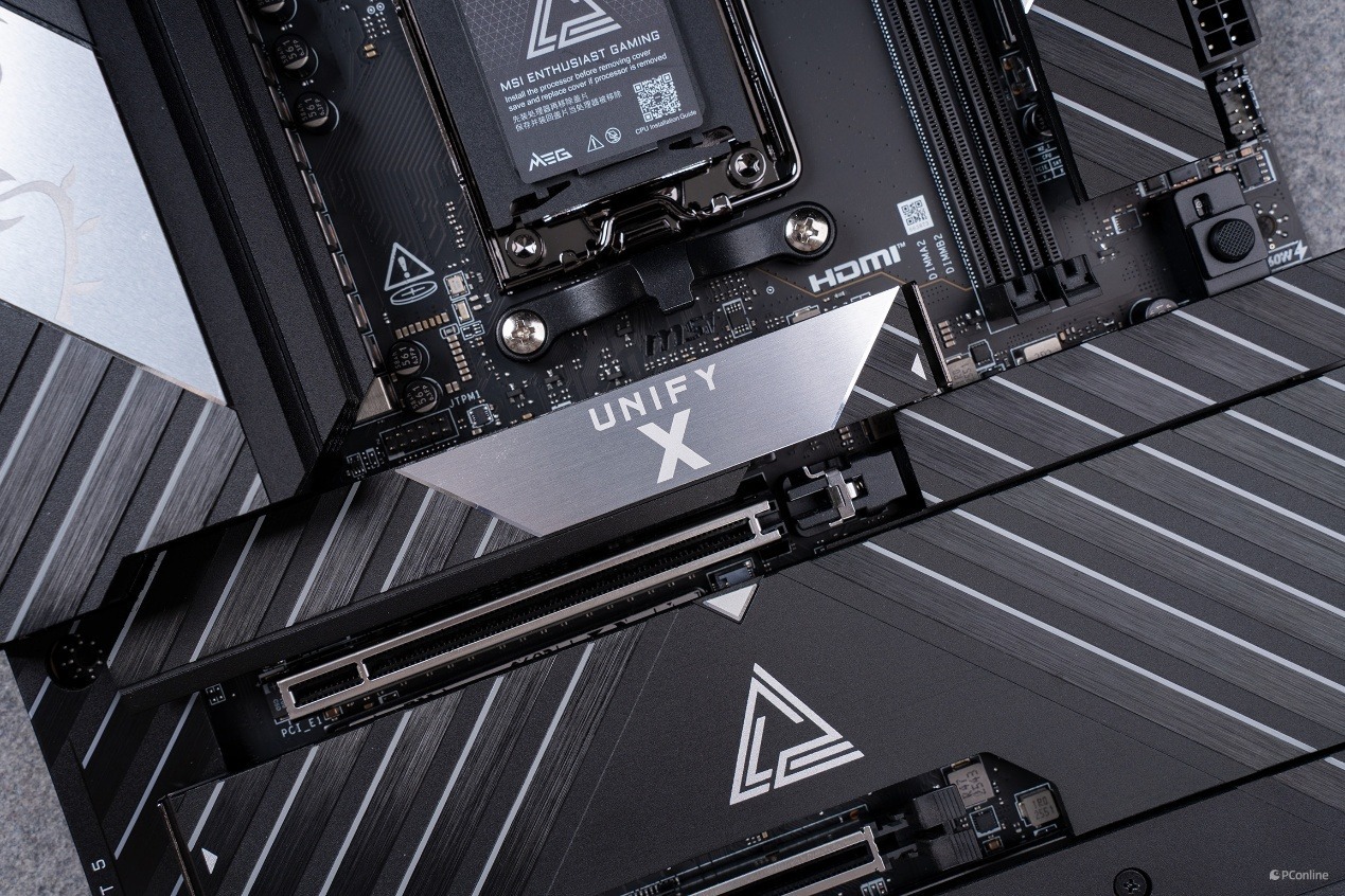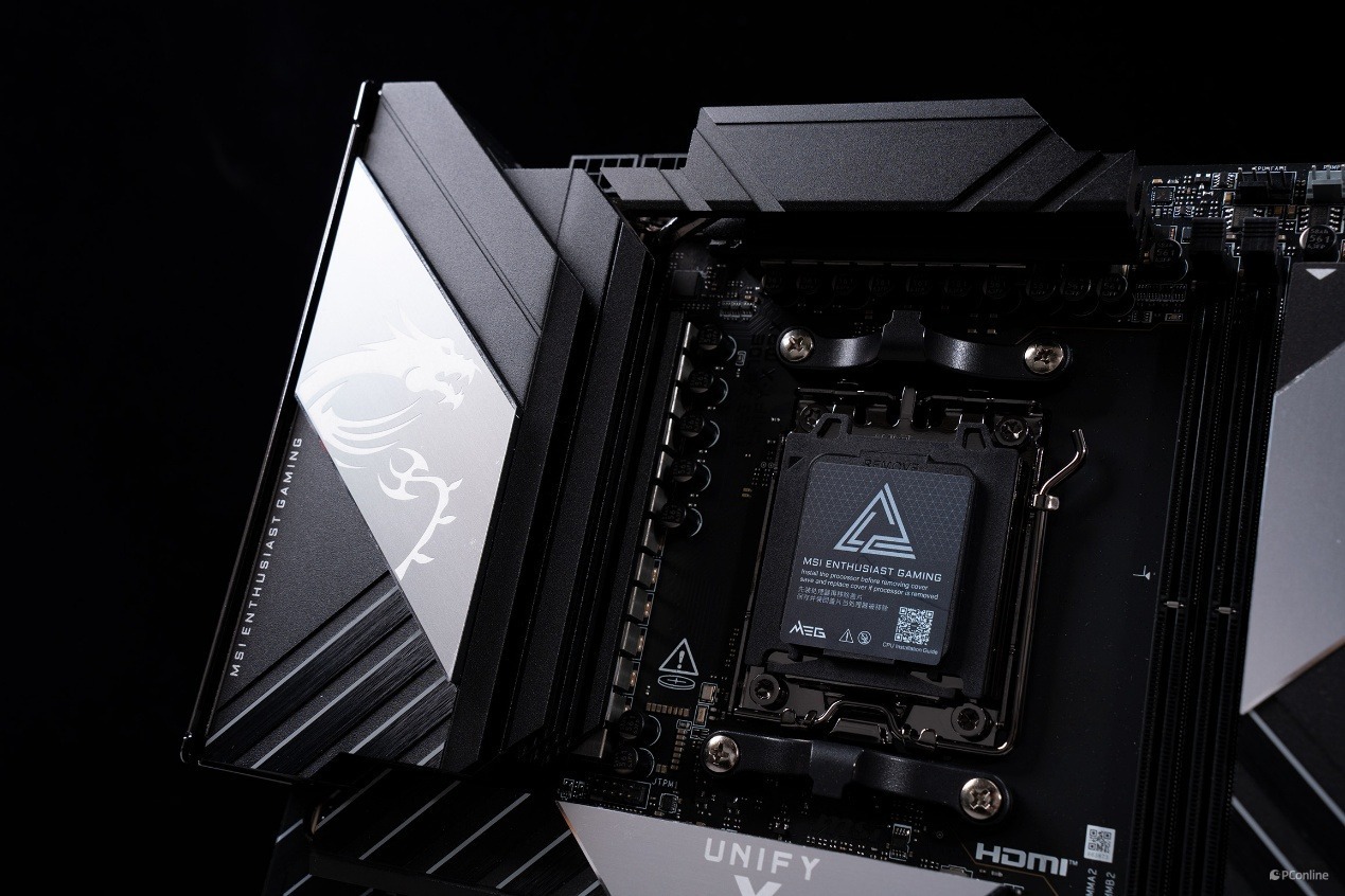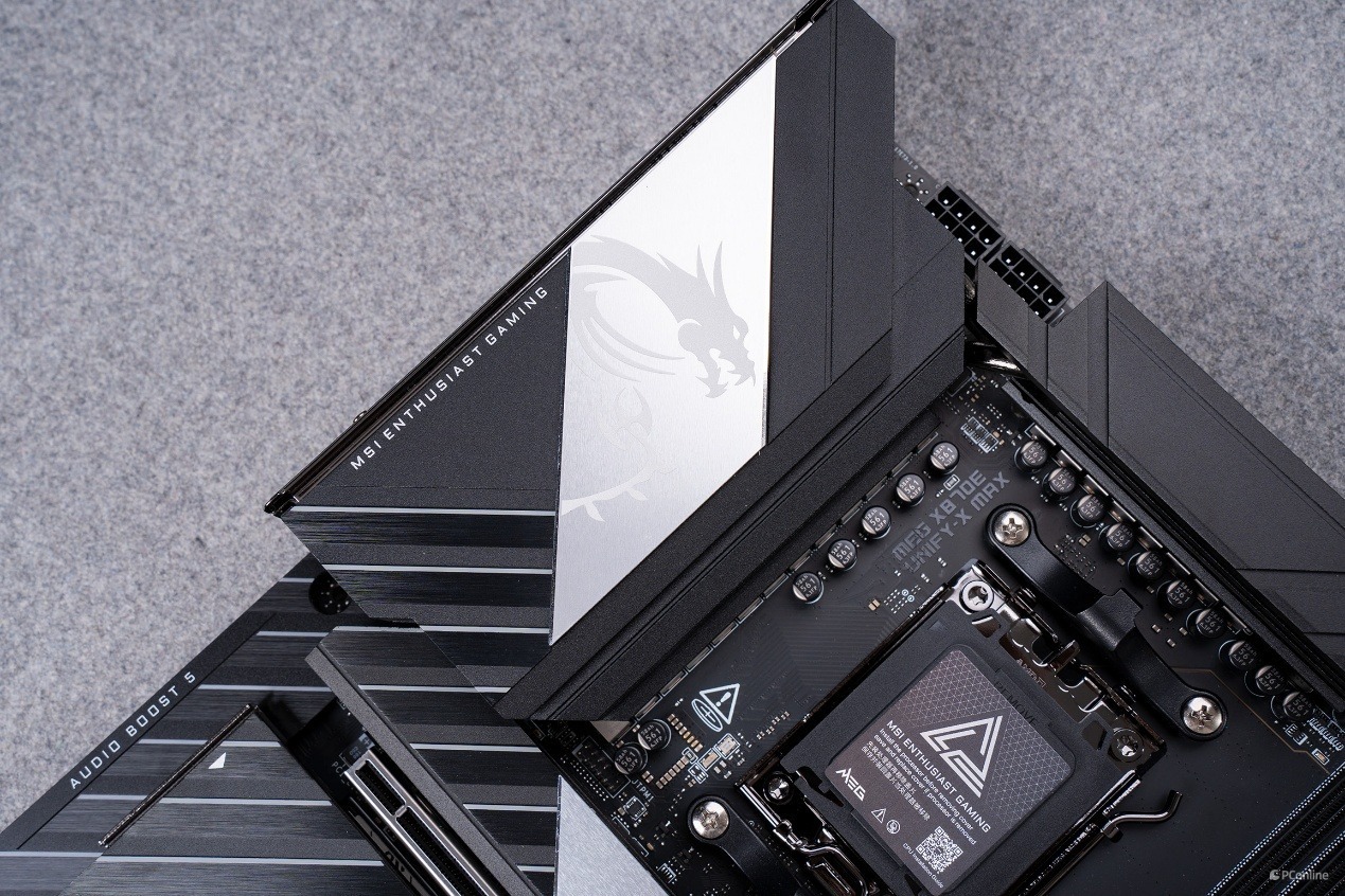 配合这套供电系统的,是微星专为超频打造的扩展型 VRM 散热模组。左侧装甲以及顶部散热装甲为一体式设计,并且外观上非常抢眼,不仅有经典的龙纹还有斜切纹理,仿佛是在呼应UNIFY-X标识的X。