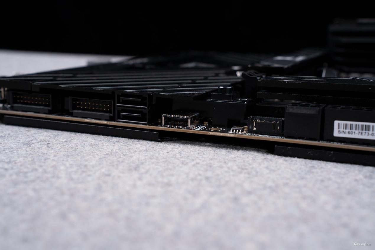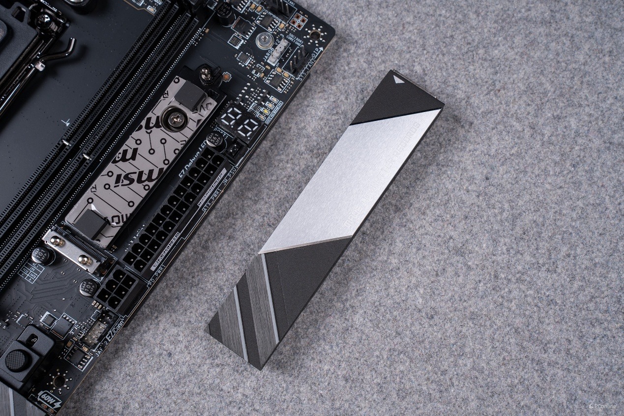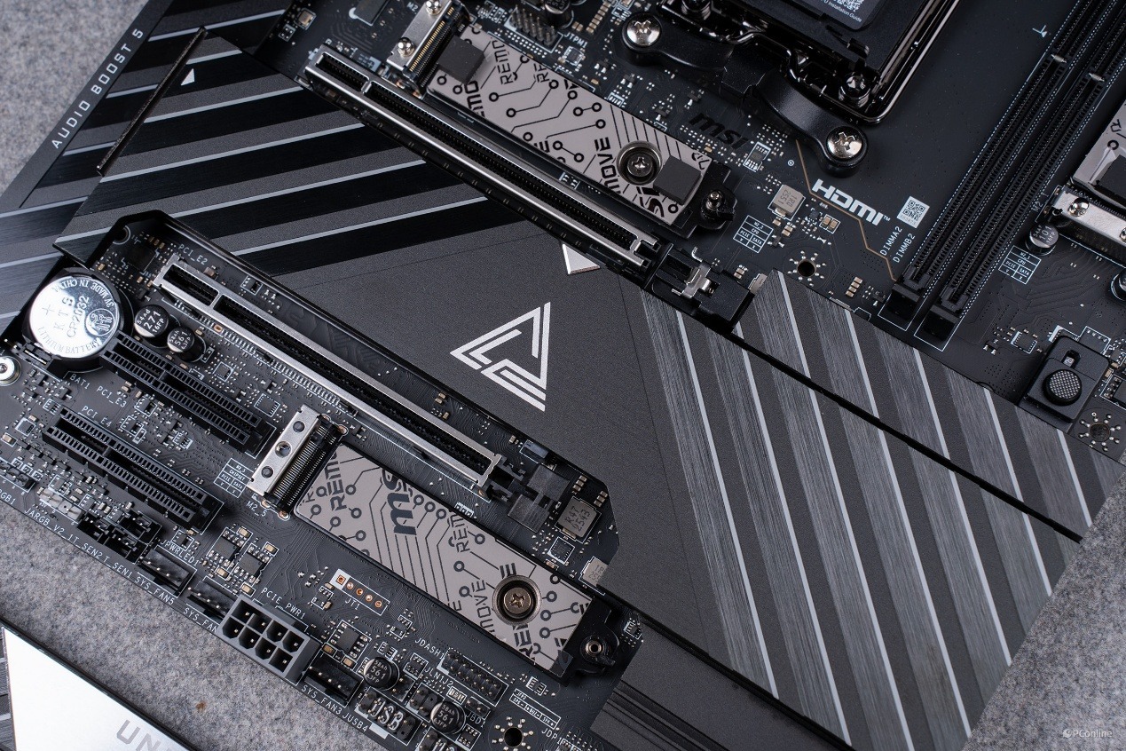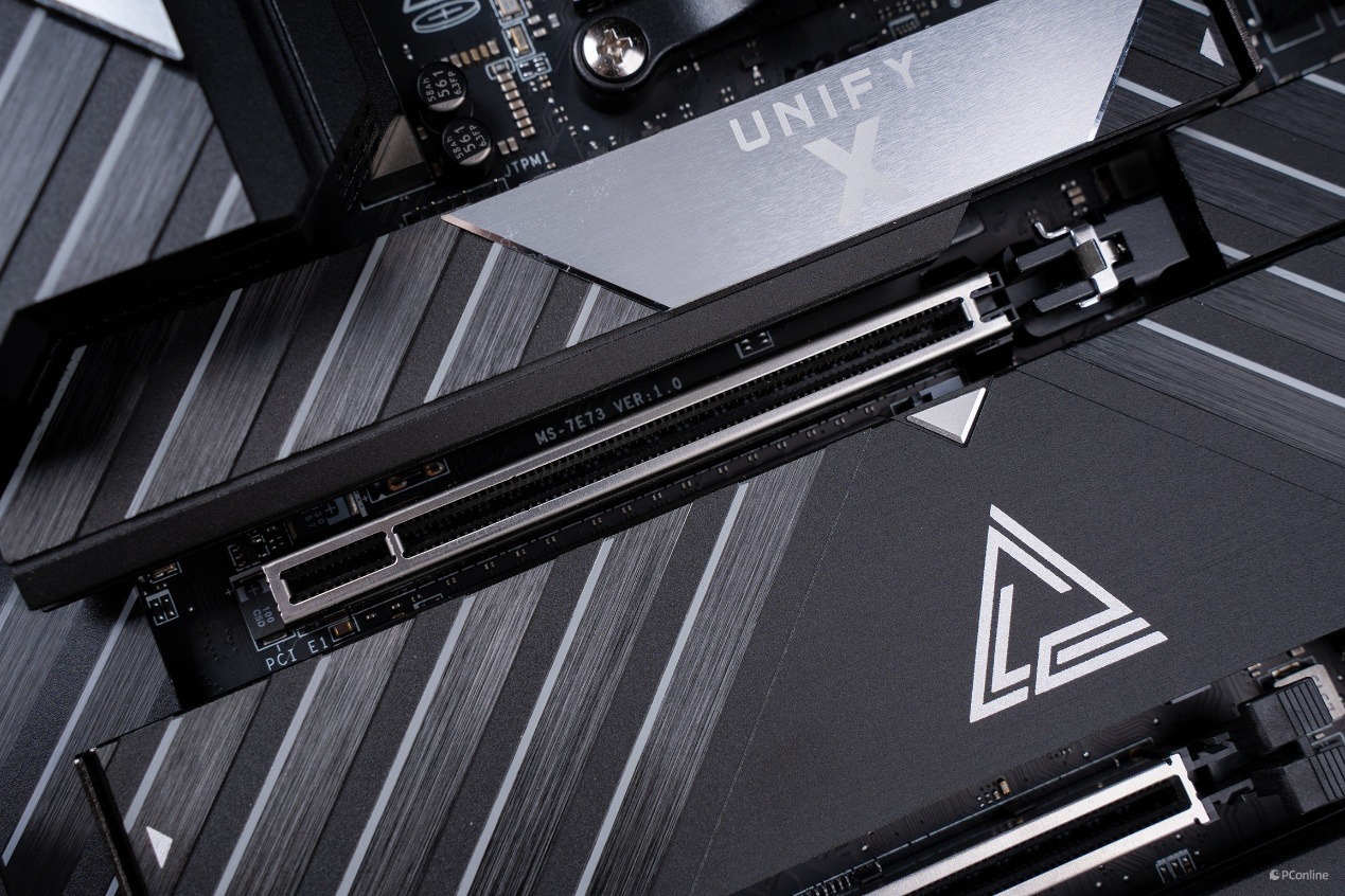 配合这套供电系统的,是微星专为超频打造的扩展型 VRM 散热模组。左侧装甲以及顶部散热装甲为一体式设计,并且外观上非常抢眼,不仅有经典的龙纹还有斜切纹理,仿佛是在呼应UNIFY-X标识的X。