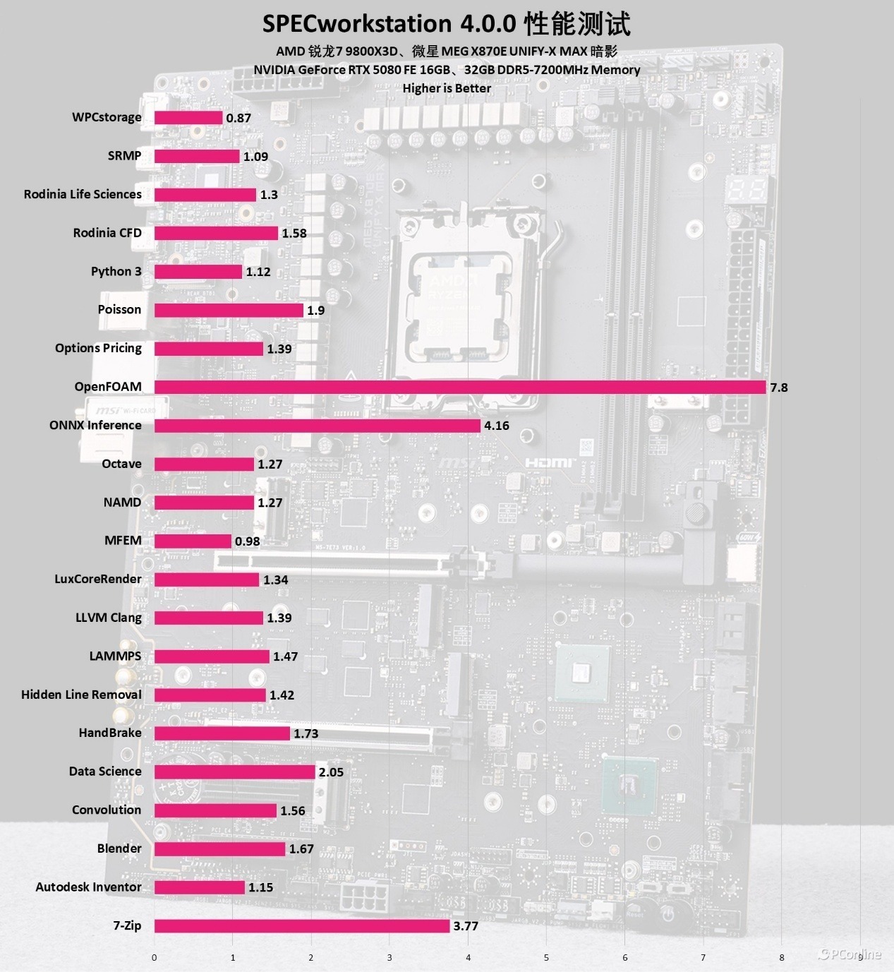 最后是 SPECworkstation 4 全方位测试,该软件通过 30 + 专业工作负载,全面考核 CPU、图形性能、I/O 带宽与内存吞吐量,覆盖媒体娱乐、金融服务、产品开发、生命科学等多领域专业场景。实测这套旗舰平台在全类别工作负载中均斩获顶级高分,充分印证了微星 MEG X870E UNIFY-X MAX暗黑主板在专业生产力场景下的全能实力,无论是复杂仿真计算、大规模数据处理还是专业图形设计,都能提供稳定且极致的性能支撑,堪称专业工作站级装机的终极标杆。