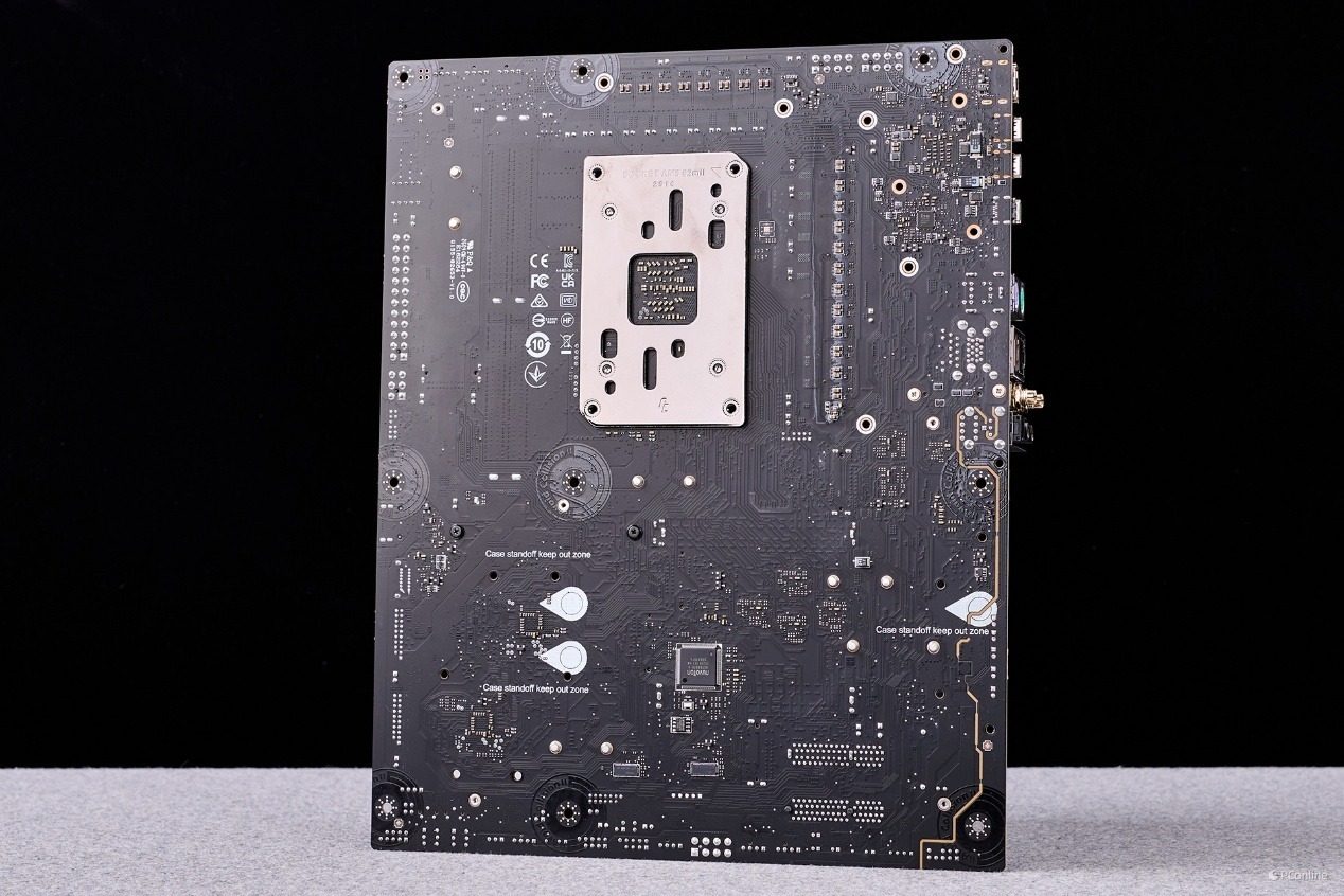 主板 PCB 采用 8 层服务器级设计,不仅大幅增强了电路传输的稳定性,更能有效屏蔽高频信号干扰,为内存与 CPU 极限超频打下坚实基础;主板背面配备了全覆盖式金属背板,既增强了主板的结构强度,避免重型显卡与散热器导致 PCB 变形,也能辅助背面元器件散热,进一步提升极限负载下的稳定性。