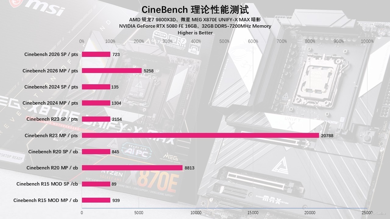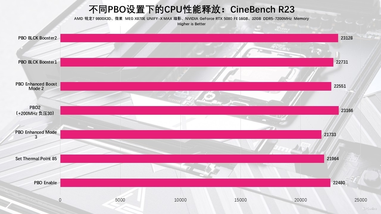 从实测数据的细节来看,MEG X870E UNIFY-X MAX 凭借 OC Engine 外频调控技术实现的性能跃升,绝非停留在参数表上的噱头,而是能在全场景负载中稳定落地的实打实性能飞跃。在针对锐龙 7 9800X3D 的专项测试中,这颗处理器在默认状态下的 Cinebench R23 多核测试已能跑出 22480 分,性能表现本就足够强悍;而当我们通过主板的 PBO BCLK Booster 功能,将外频精准稳定锁定在 103MHz,其多核分数直接飙升至 22731 分,如果更激进一些,开启PBO BCLK Booster第二档,将外频固定在105MHz,那分数还可以进一步上探23128分。当然,PBO2我们也进行了测试,我们将基准频率超200MHz,同时负压30的情况下,性能甚至还能再涨点,R23多核跑分最高23166。