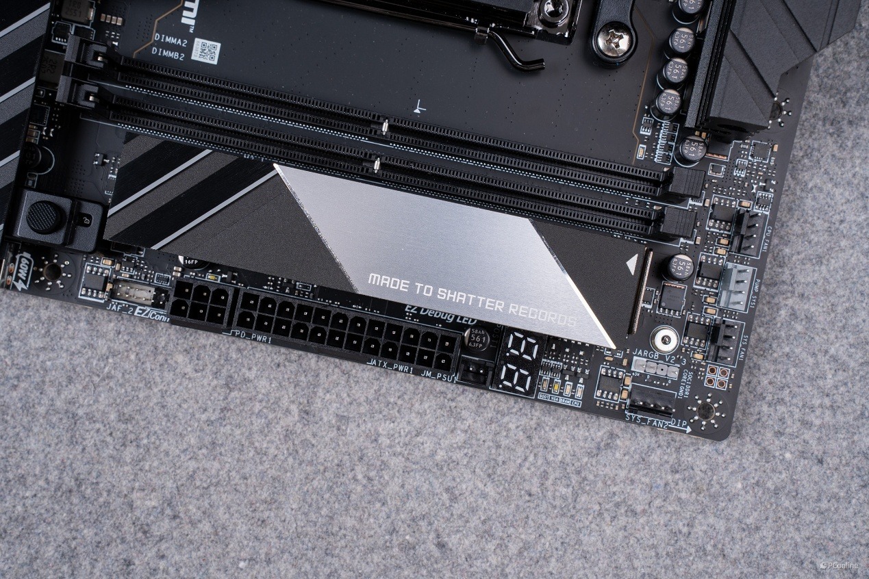 除此之外,在细节设计上,这块主板完全读懂了超频玩家的需求。主板板载了完整的物理控制按键,包括电源键、重启键、清除 CMOS 按键、多重 BIOS 切换开关,还有专为超频设计的低温启动跳线、超频安全启动 BIOS 跳线,配合板载的 4 组简易侦错 LED、EZ 内存检测 LED 与 EZ 数字侦错 LED,即便裸板调试,也能快速完成开机、重启、故障排查等操作,彻底告别了超频调试中反复短接跳线、用螺丝刀开机的麻烦。