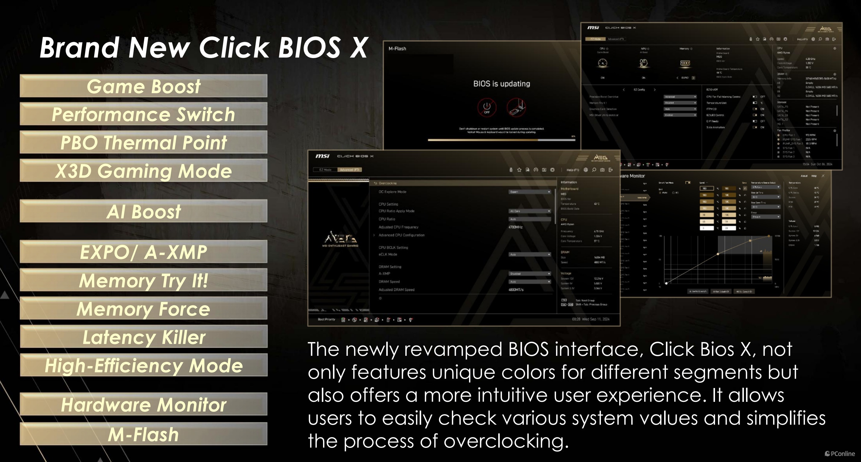 说到使用体验就不得不提这款主板搭载了全新升级的 Click BIOS X 图形化 BIOS,界面升级至 1080P 清晰度,整体 UI 设计更简洁,逻辑更清晰,不同功能模块用不同颜色做了区分,无论是新手还是老玩家,都能快速找到自己需要的设置选项。