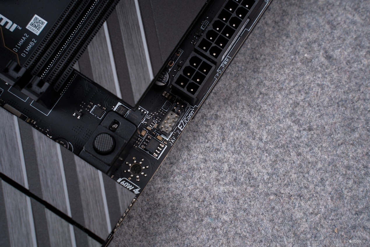 同时插槽配备了 EZ PCIe 快拆按钮,轻轻一按即可完成插槽卡扣的锁定与解锁,彻底解决了传统显卡拆装中卡扣难按、空间受限的痛点,即便是已经装好整机的状态,也能轻松完成显卡的拆装。