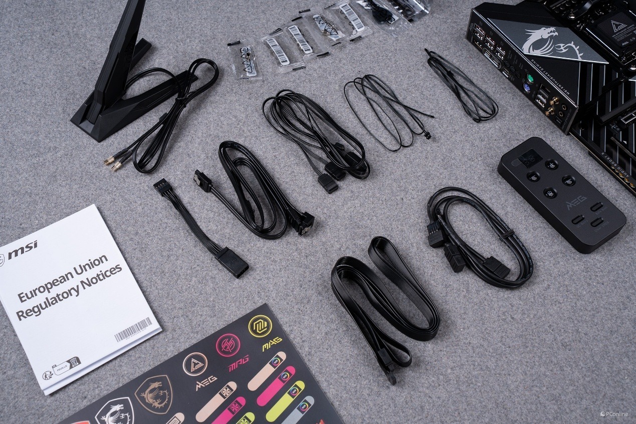 开启包装盒,首先映入眼帘的是专为超频玩家准备的丰富配件,除了常规的 SATA 数据线、WiFi 天线、导热贴与说明书外,这块主板还带来了诸多超频专属配件:专属 Tuning Controller 调试控制器、EZ 前置面板连接线、1 to 3 EZ Conn-Cable (V2)、1 to 3 ARGB Gen2 延长线、EZ M.2 Clip II 拆卸器与 5 组 EZ M.2 Clips II,还有 2 根热敏电阻线缆与预装驱动和工具的 U 盘,从装机到超频调试的全流程需求,都被一次性覆盖。