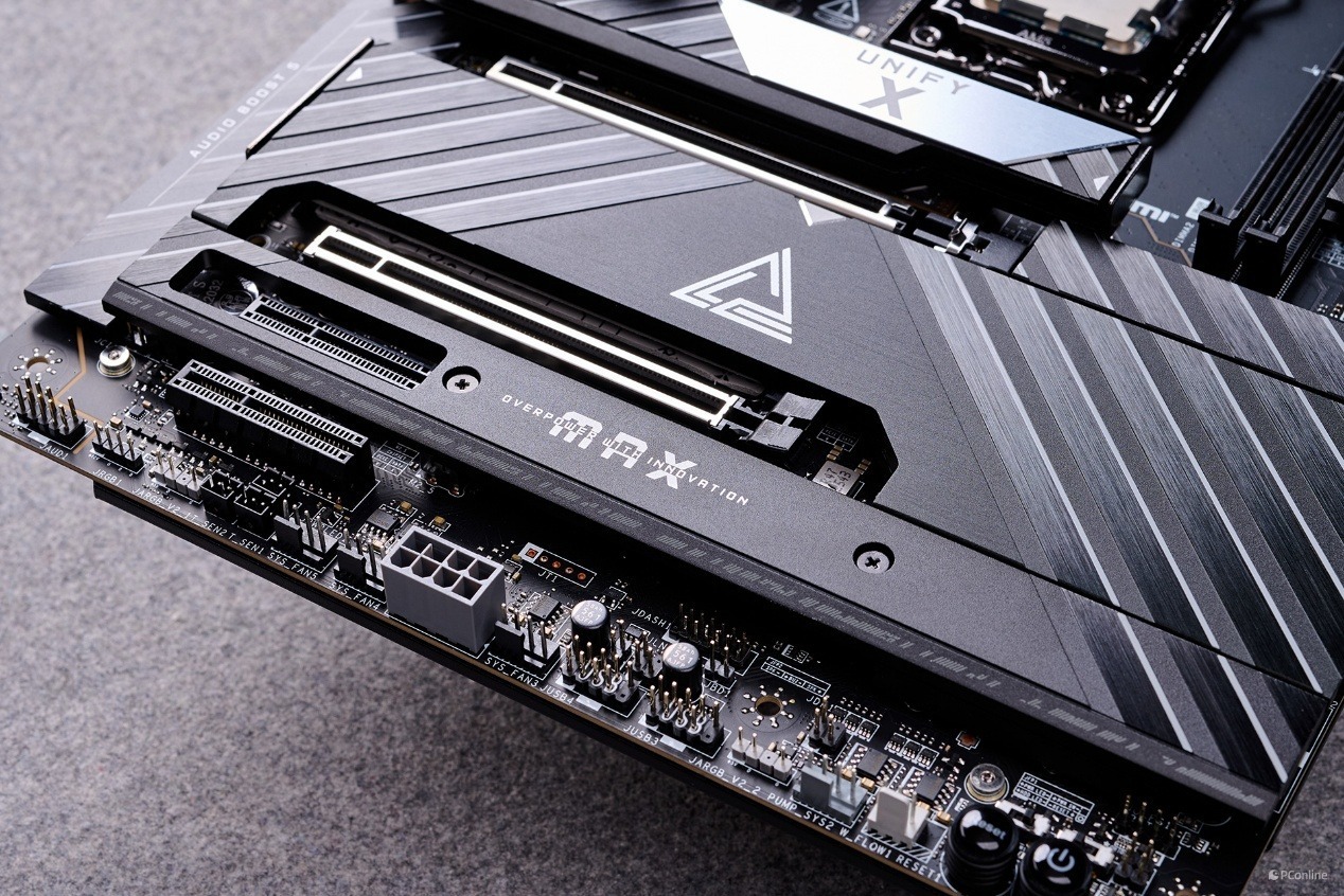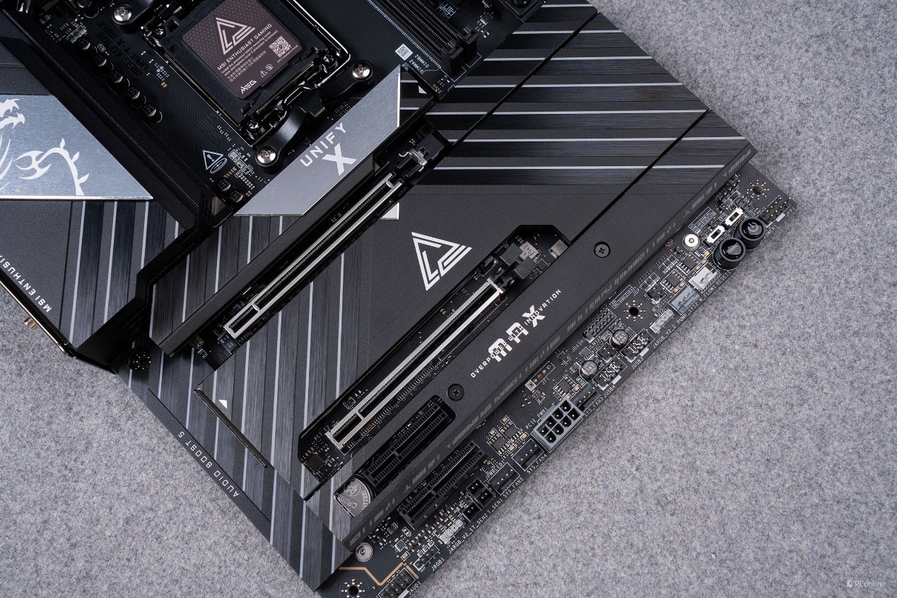 在扩展性能上,微星MEG X870E UNIFY-X MAX暗影做到了“专精超频”与“全能扩展”。PCIe 插槽方面,主板配备了 1 条 CPU 直出的 PCIe 5.0 x16 全速插槽,1 条 PCIe 5.0 x8 插槽,1 条 PCIe 4.0 x4 插槽与 1 条 PCIe 3.0 x4 插槽,通过优化的 PCIe 通道拆分设计,CPU 原生的 PCIe 5.0 通道可以让 Gen5 x16 显卡插槽与双 Gen5 M.2 接口独立运行,完全不会出现带宽冲突的问题,既能保证旗舰显卡的满血性能释放,也能让高速 SSD 跑满标称带宽。