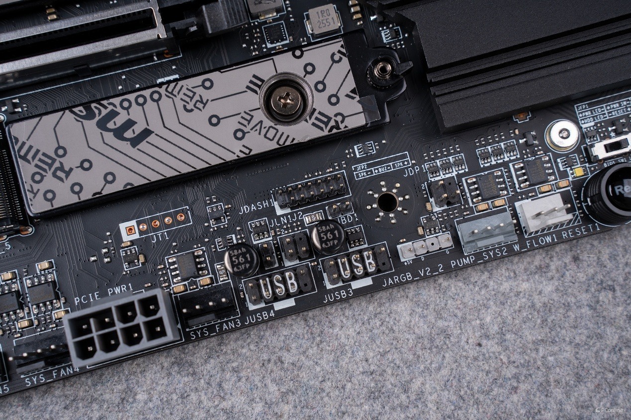 主板还为机箱前置接口提供了极为丰富的 USB 扩展能力,充分满足玩家前置外设连接、高速数据传输、设备快充的全场景需求。前置 USB 接口方面,主板配备了 1 个JUSBC1 USB 20Gbps Type-C 前置面板接口,该接口由 X870E 芯片组原生提供,支持 USB 3.2 Gen2x2 20Gbps 的满速传输速率,同时采用 Type-C 接口设计,支持正反盲插,完美适配新款机箱的前置 Type-C 面板。