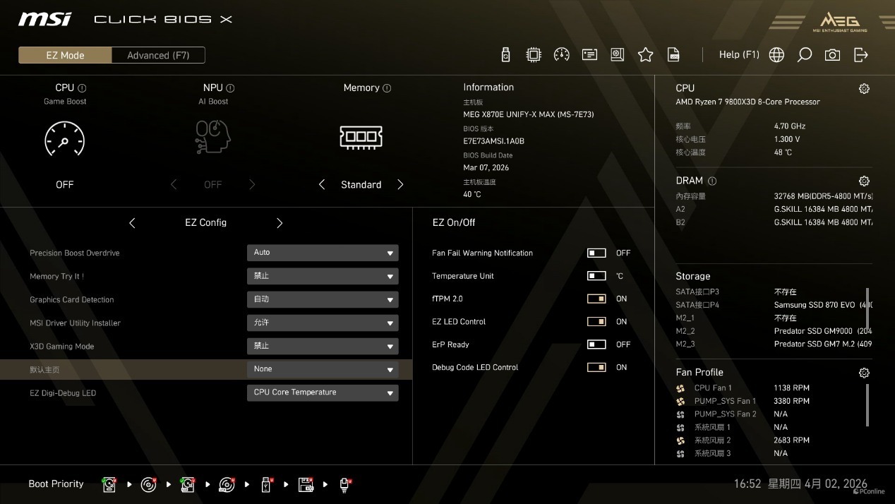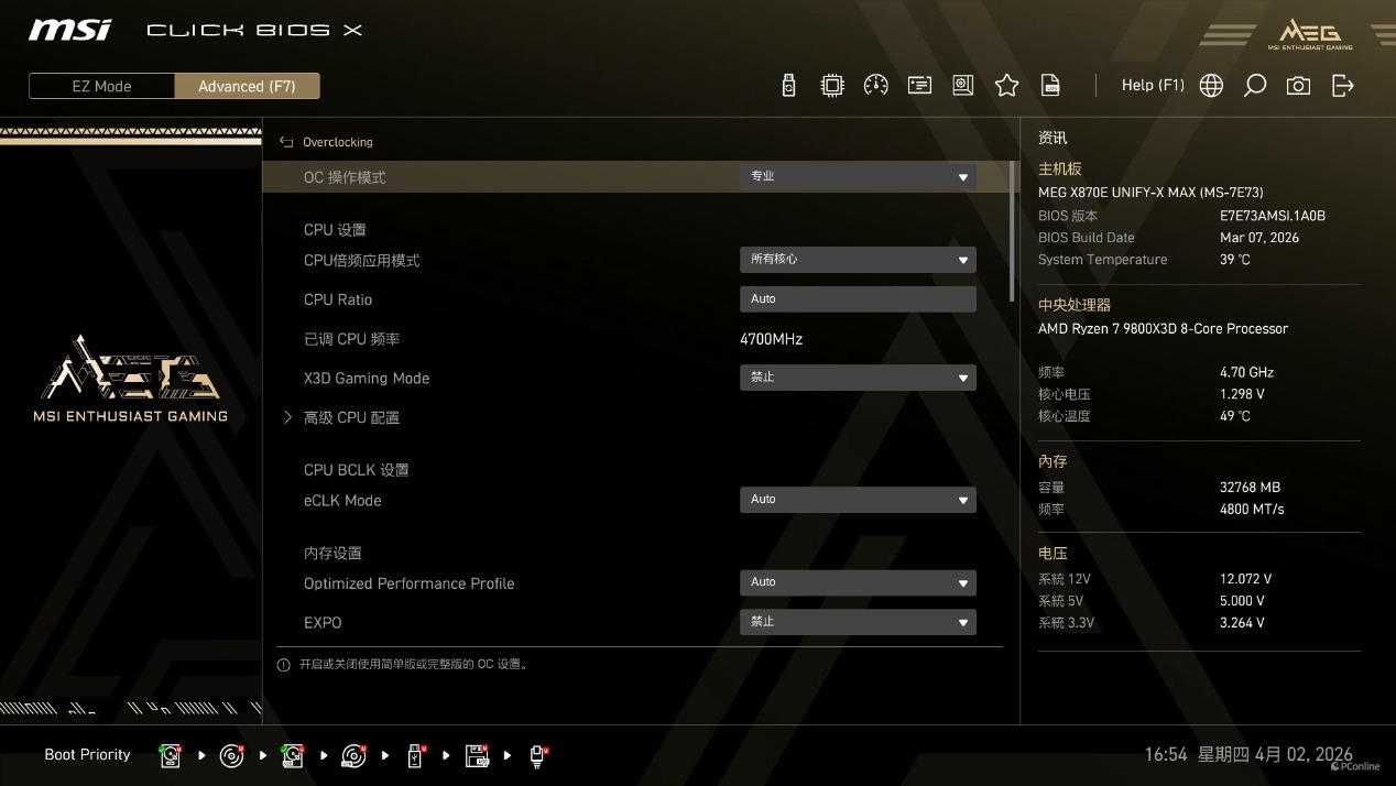 首次进入BIOS即是简易模式,不过已经整合了全套的超频功能,包括一键超频、PBO 设置等,顶端则还有M-FLASH BIOS更新、常用功能收藏夹、BIOS变更选项记录、等功能按键。常用选项都被放在了首页,玩家无需层层翻找,即可完成核心参数的调节。
