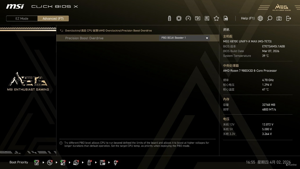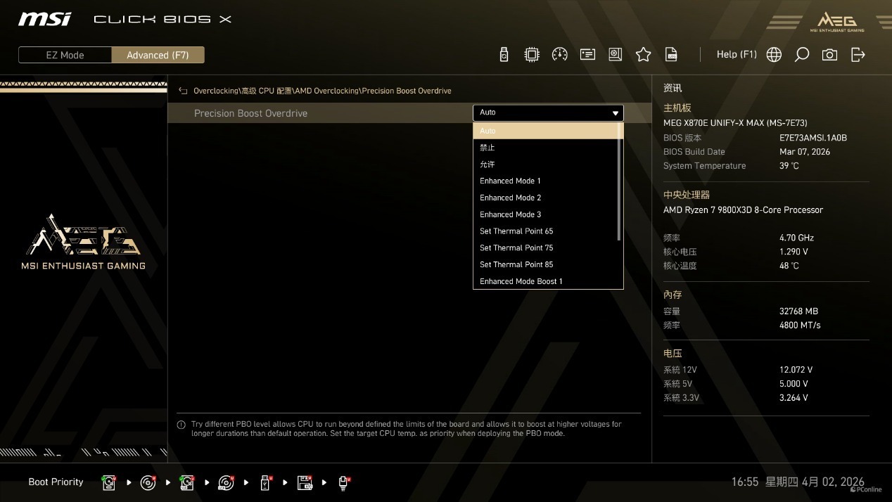 在上面的BIOS介绍环节中,我们已经了解到了微星MEG X870E UNIFY-X MAX 暗影主板的PBO中包含了不少模式,基本可以分成三种类型,包含三档随数字增大而逐渐激进的Enhanced Mode,三档预设温度墙的Set Thermal Point,以及两档最激进的Enhanced Boost Mode,以及专为极致性能释放打造的超外频 PBO BCLK Booster 模式。