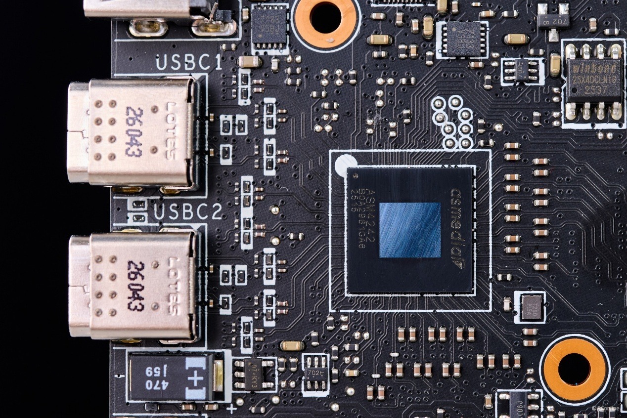 而两个USB 4接口则是由祥硕ASM4242主控提供,这款主控还获得了雷电4认证,这也让其成为全球少数拥有独立型USB4及雷电4双认证的主控端芯片,未来出现雷电4的AMD主板也不是不可能。