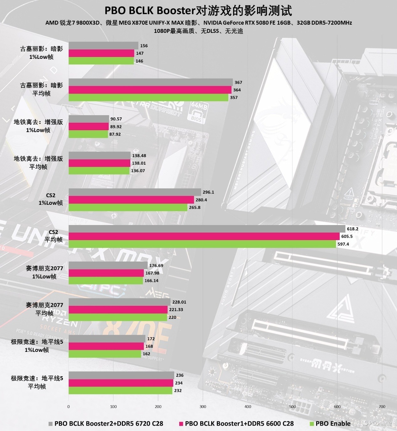 上面我们也提到了这款主板有个极致的PBO BCLK BOOSTER模式,这里我们也试试这个模式对游戏有何影响。开启 PBO BCLK Booster,将 BCLK 外频拉至 103MHz,保持内存、PCIe 等设备频率不变,此时处理器的全核频率与单核频率都得到了明显提升,测试成绩也随之变化:《古墓丽影:暗影》平均帧率由原本的357FPS提升至 364FPS,提升幅度约 2%;《CS2》平均帧率则提升至605.5FPS,提升幅度约 1.4%,整体游戏帧率提升 1%-3%,全程稳定运行,没有出现任何卡顿、掉盘的问题。
