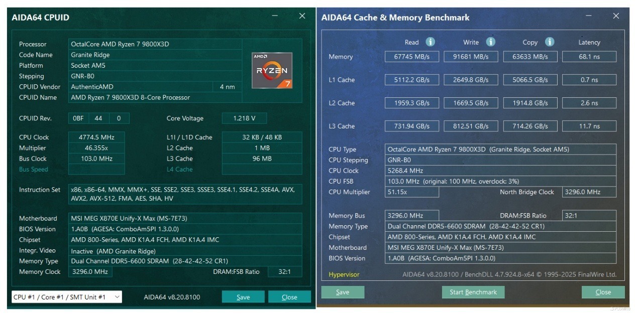 要知道,锐龙 7 9800X3D 这类以 3D V-Cache 堆叠技术为核心的游戏专属处理器,本身对电压、频率的波动极为敏感,行业内普遍认为其 “出厂即灰烬”,几乎没有额外的超频挖掘空间。而 MEG X870E UNIFY-X MAX 凭借板载外置时钟发生器带来的精准异步外频调控能力,以及 UNIFY 系列深耕多年的极限超频调校功底,硬是在这颗公认超频上限极低的处理器上,挖掘出了如此可观的性能潜力,这份硬核的调校实力,也恰恰印证了其专为破纪录而生的产品内核。