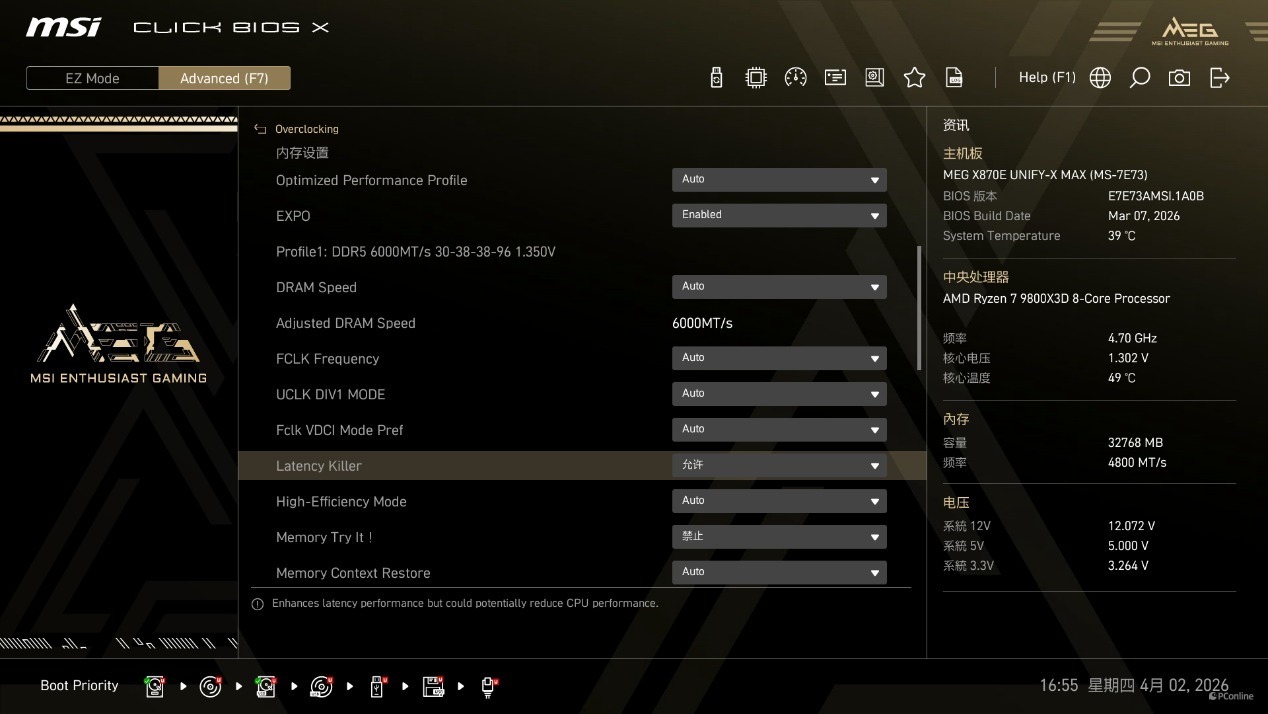 为了让不同层级的玩家都能享受到内存超频的乐趣,微星在这块主板的 BIOS 中,集成了全套的内存超频专属功能,从新手友好的一键超频,到老玩家需要的精细时序调节,一应俱全。