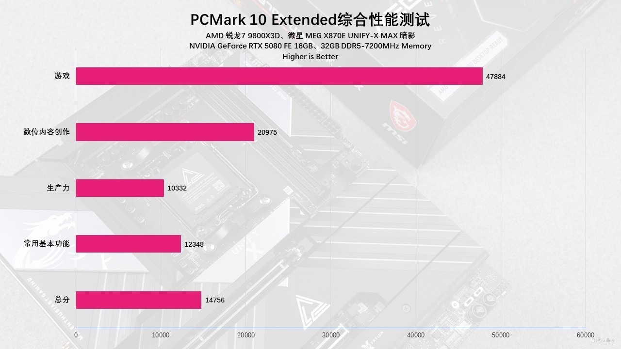 细分数据尤为亮眼:常用基本功能得分12348,生产力得分10332,数位内容创作更是高达20975。而在游戏环节,47884的惊人高分充分释放了Zen5架构与先进工艺的性能红利。可以说,正是微星MEG X870E UNIFY-X MAX 暗影主板稳健的电气性能,才让CPU和显卡得以火力全开,带来如此丝滑的全能体验。