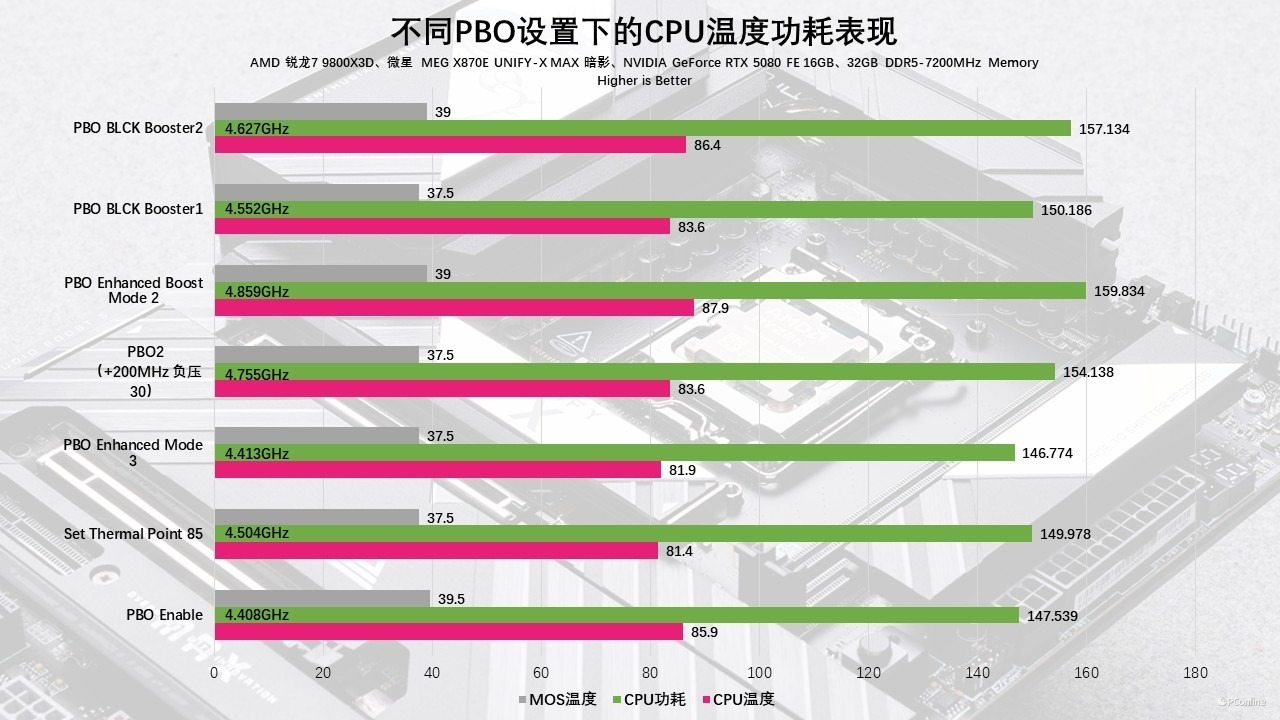 进阶档位中,PBO Enhanced Mode 3 可将 CPU 核心频率拉升至 4.413GHz,功耗与温控表现和 PBO2 基本持平;定位更激进的 PBO Enhanced Boost Mode 2,实现了 4.859GHz 的超高核心频率,烤机功耗达到 159.834W,为本次测试中功耗释放最高的档位,对应核心温度 87.9℃,MOS 温度 39℃。而对于核心温度更为敏感的用户,Set Thermal Point 85 档位可在 81.4℃的低核心温度下,实现 4.504GHz 的核心频率,在严格控温的同时,依然带来了可观的性能提升。