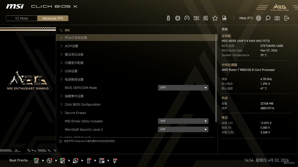 如果你按下F7还能进入高阶模式,这里还集成了 AI Boost 游戏加速引擎、X3D Gaming Mode、内存相关的全套优化功能。例如在System Status菜单可以看到主板的信息,例如哪个M.2接口接入了硬盘,名称是什么,能够随时掌握硬件状态。Advanced菜单则是进阶的设置选项,这里能够进行PCIe进行拆分,开启Re-Size BAR、关闭核显等操作。
