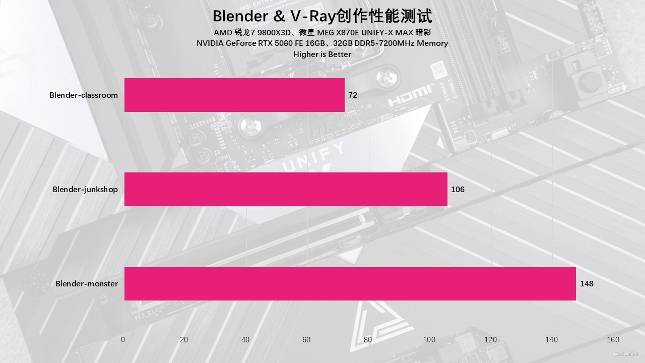 渲染性能方面,搭载锐龙7 9800X3D 的微星 MEG X870E UNIFY-X MAX暗黑主板平台同样表现炸裂。在 Blender 三大场景渲染测试中,凭借主板对 CPU 性能的极致释放、高速 PCIe 5.0 通道与内存超频优化,渲染速度快且稳定,复杂模型与光影效果的计算效率远超同级;若搭配顶级专业显卡,更能解锁 GPU 加速渲染的高阶潜力,进一步刷新渲染效率天花板。