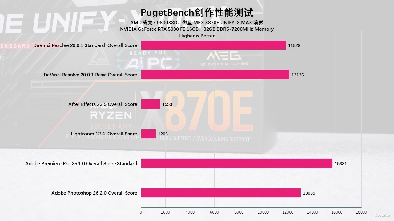理论性能之外,真实的生产力效率同样关键。我们使用PugetBench对常用的Adobe软件群进行了全方位测试,以还原最严苛的用户使用场景。实测证明,微星MEG X870E UNIFY-X MAX 暗影主板能够完美驾驭锐龙7 9800X3D,在图像后期与视频导出等重任务中表现得游刃有余,整体运行效率拔群。