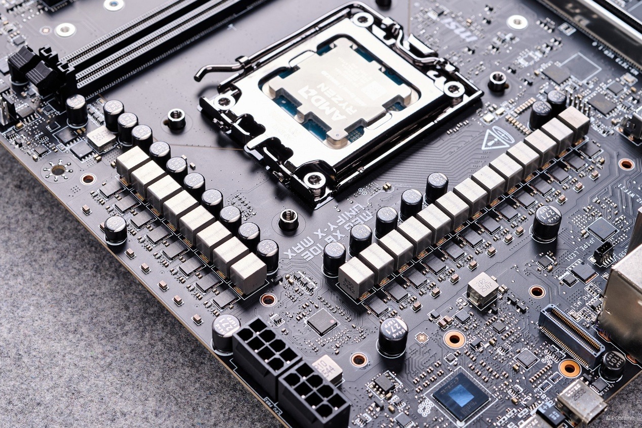 极限超频的核心,离不开一套足够强悍的供电系统。MEG X870E UNIFY-X MAX 搭载了 18(110A)+2+1 相智能供电设计,其中 18 相核心供电每相都配备了 110A 的高电流 SPS 智能功率级芯片,2 相 SOC 供电与 1 相 Misc 辅助供电也采用了独立的高规格芯片,完全可以轻松驾驭锐龙 9 9950X、锐龙 9 9950X3D 这类旗舰级处理器,即便是极限超频带来的超高瞬时功耗,也能提供稳定、持续的电力输出。