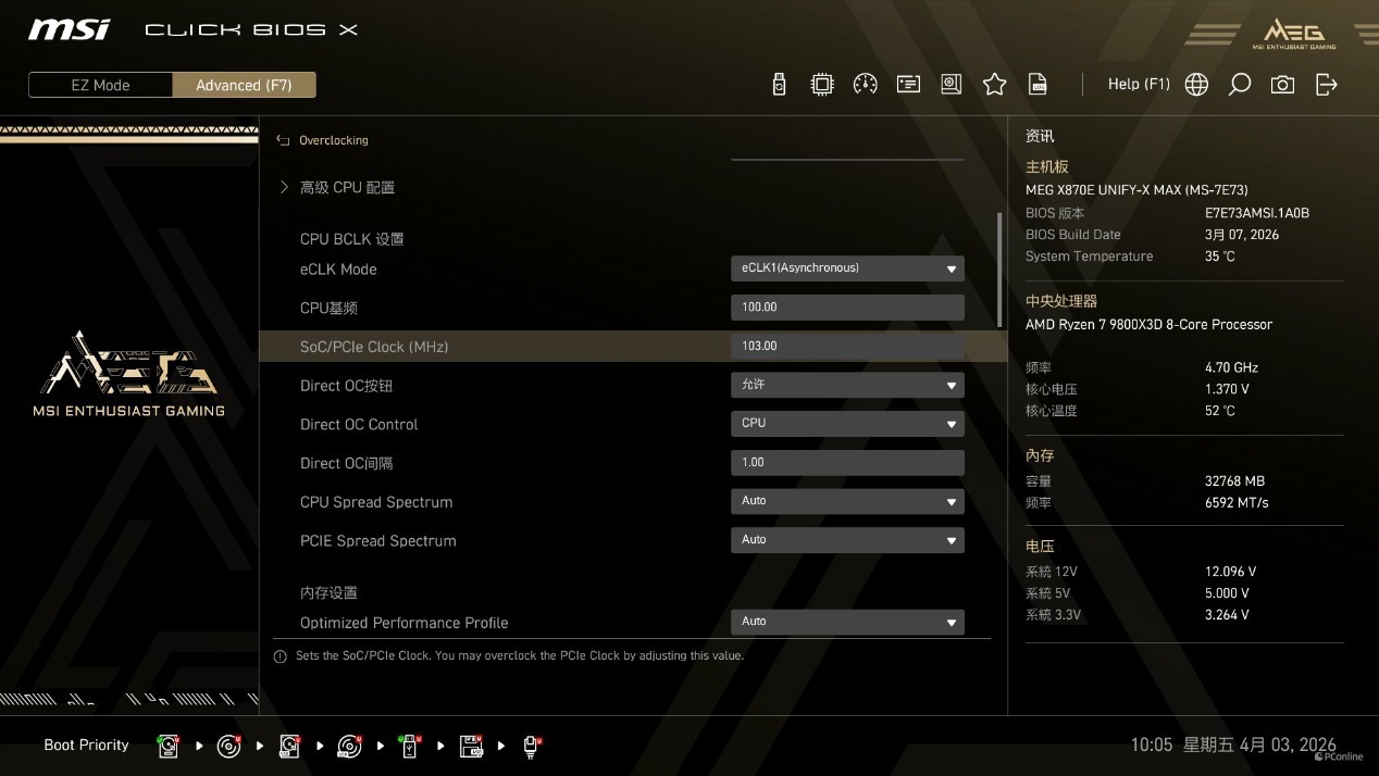 当然,这款主板还不止内存超频,它还能做到超CPU外频的能力,在 AM5 平台上,外频超频一直是发烧友释放处理器潜力的核心方式,但传统主板超外频时,往往会导致内存、PCIe、NVMe 等设备同步超频,极易出现系统不稳定、设备掉盘等问题,而微星MEG X870E UNIFY-X MAX暗影通过独家的 OC Engine 技术,彻底解决了这一痛点。
