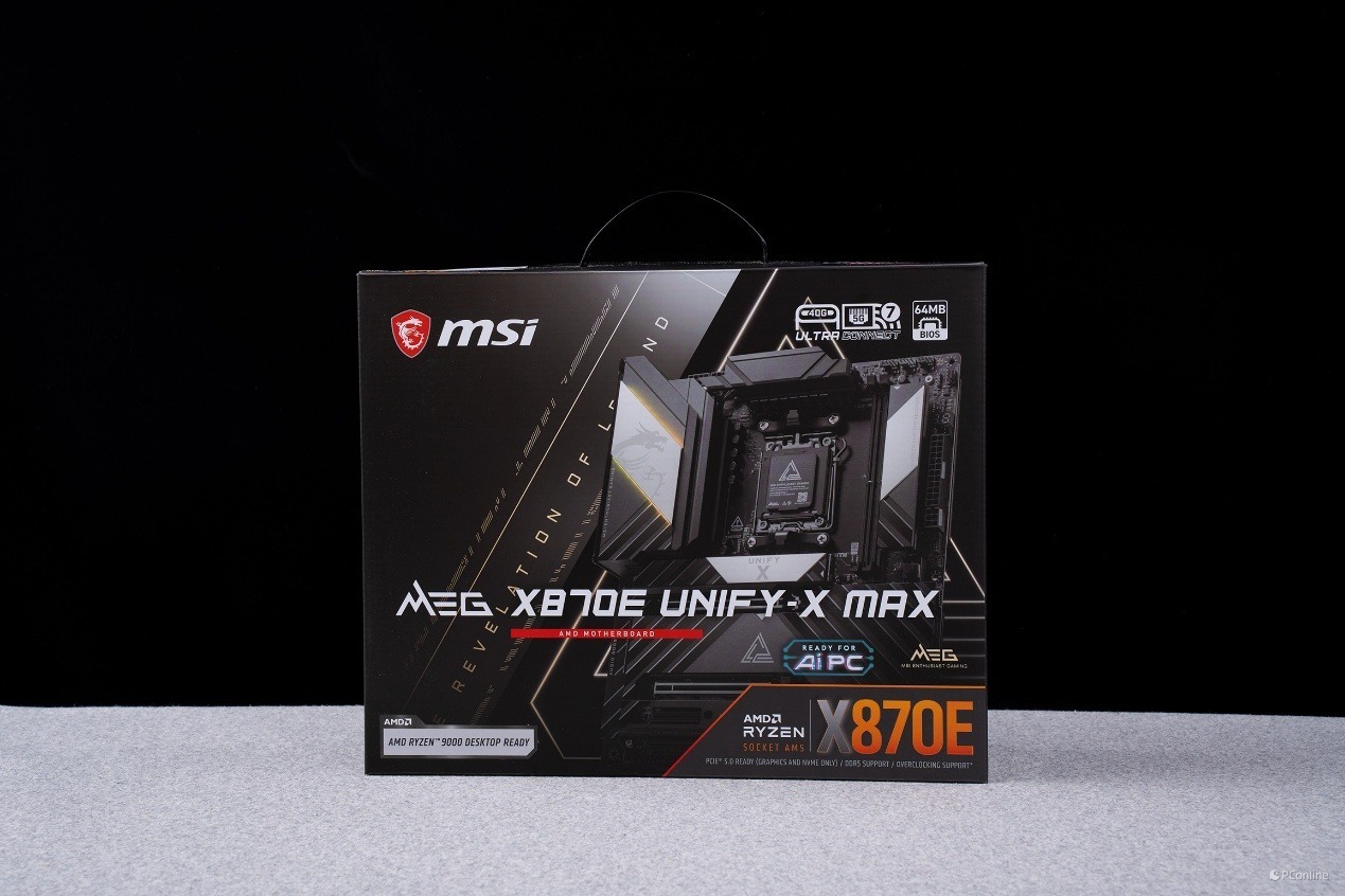 和主打全能旗舰的 GODLIKE 系列不同,UNIFY-X MAX 从包装到本体,都透着一股 “硬核超频” 的极简气场。外包装以哑光黑为基底,辅以标志性的 UNIFY 系列线条设计,醒目的型号标识与 X870E 芯片组徽章,直接点明了它的旗舰级定位,没有多余的装饰,只把纯粹的性能感拉满。