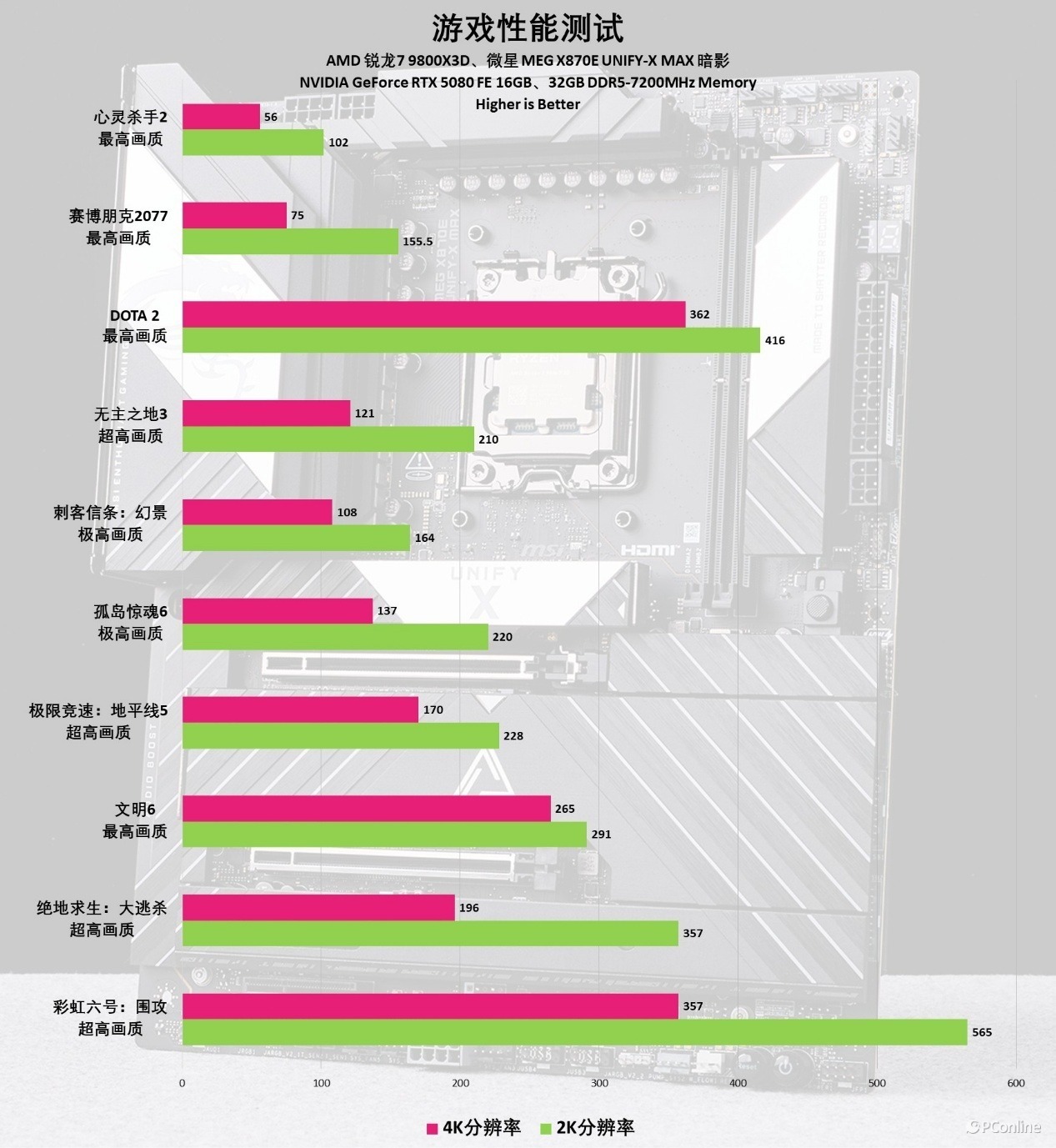下面是玩家最关心的游戏环节。我们分别在2K和4K画质下运行了多款3A巨制。依托微星MEG X870E UNIFY-X MAX 暗影主板坚若磐石的底座支撑,锐龙7 9800X3D搭配RTX 5080展现出了恐怖的统治力,全程帧数又高又稳。显然,如果你想组建一套征服4K游戏的顶级平台,微星主板在性能挖掘上的功力完全能满足你的期待。