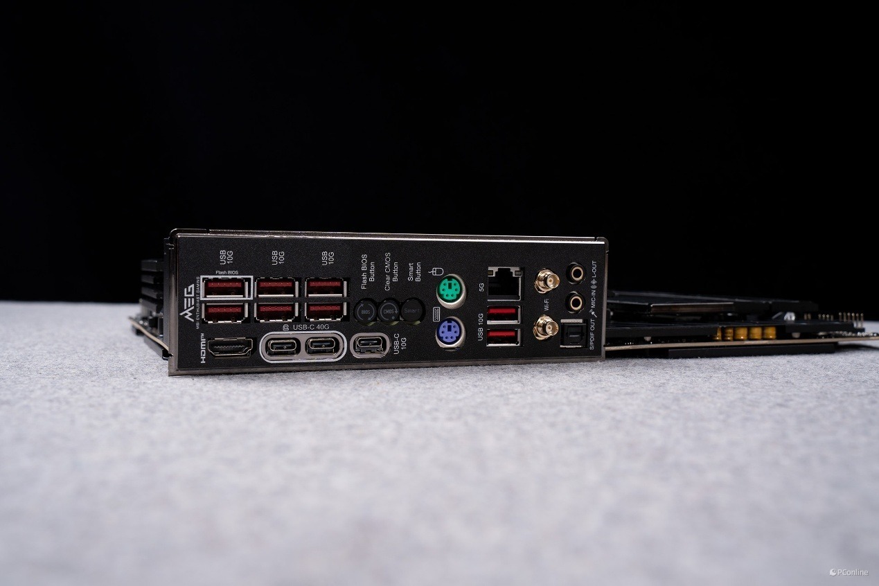 后置 I/O 接口方面,微星MEG X870E UNIFY-X MAX暗影直接给到了超频玩家需要的满配规格,无需额外扩展,即可满足多设备连接与调试需求。具体包括:1 个 HDMI 2.1 接口,支持 8K@60Hz 视频输出;2 个 USB 40Gbps Type-C 接口,分别由 CPU 与 ASM4242 主控提供,支持超快传输速度与视频输出;1 个 CPU 直出的 USB 10Gbps Type-C 接口,8 个 USB 10Gbps Type-A 接口;同时保留了 PS/2 键鼠接口,为老款专业外设提供了兼容性。