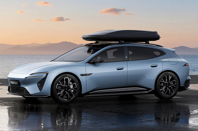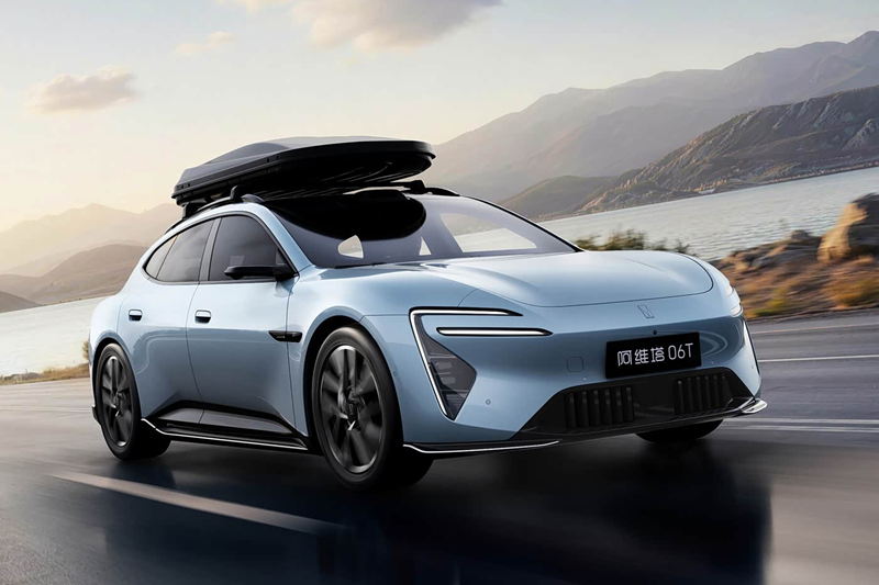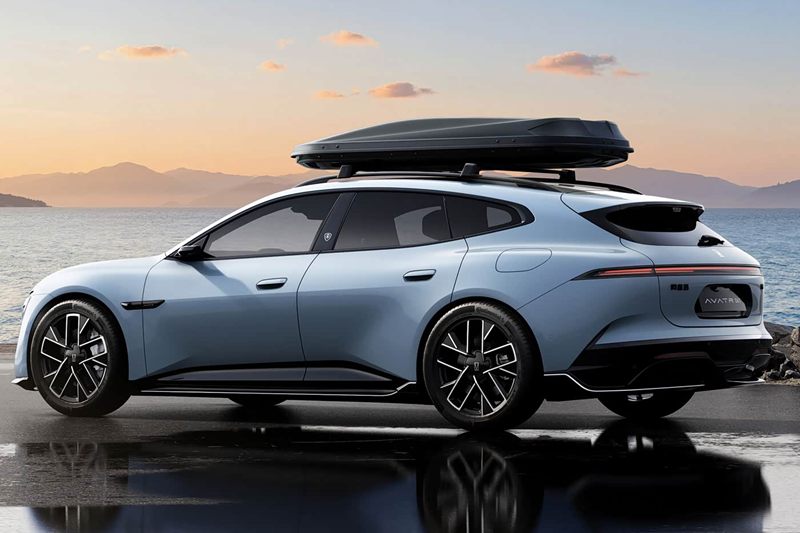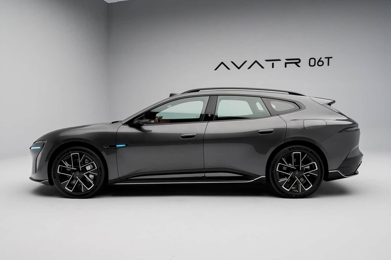 来到侧面,则是阿维塔06T“变形”的重点。这款车没有采用传统三厢造型,而是将旅行车、猎装车的元素整合到一起,配合上扬的腰线与车顶行李架,带来了更修长更运动的跨界风格。