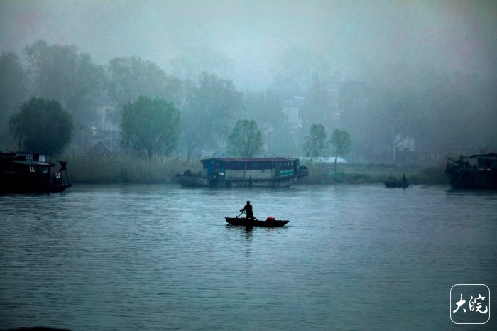 此时的淮水,在雾霭里静静流淌,水色与雾色交融,分不清边界。对岸的堤岸、树木与屋舍,都隐在了这乳白色的纱幔之后,像极了宣纸上未干的淡墨,透着几分空灵与悠远。