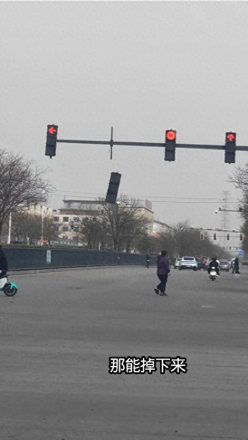 视频里,信号灯先是上下晃动,期间,还有行人和骑电动车的从下面经过,随后,其中一个信号灯直接掉下来,好在没有砸到人。