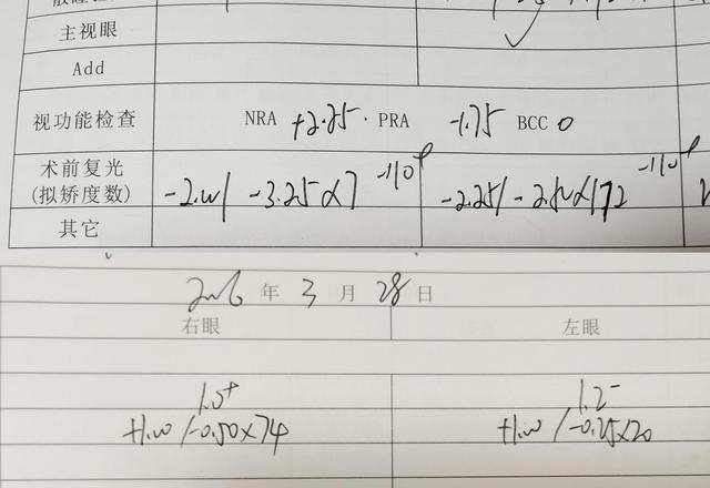 (▲袁同学全光塑手术前术后验光度数如图所示)
