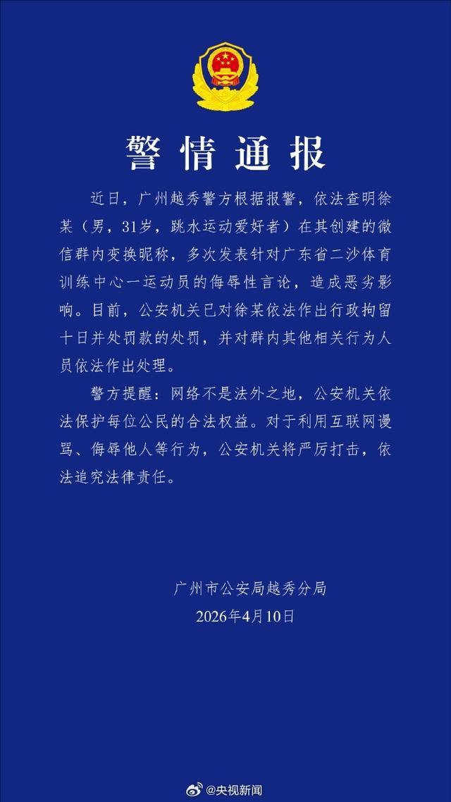 北京时间4月10日,广州市公安局越秀分局警方发布警情通报,称一男子徐某因多次发布针对广东省二沙体育训练中心一运动员的侮辱性言论,被行拘10天。