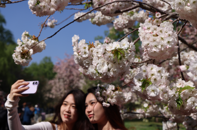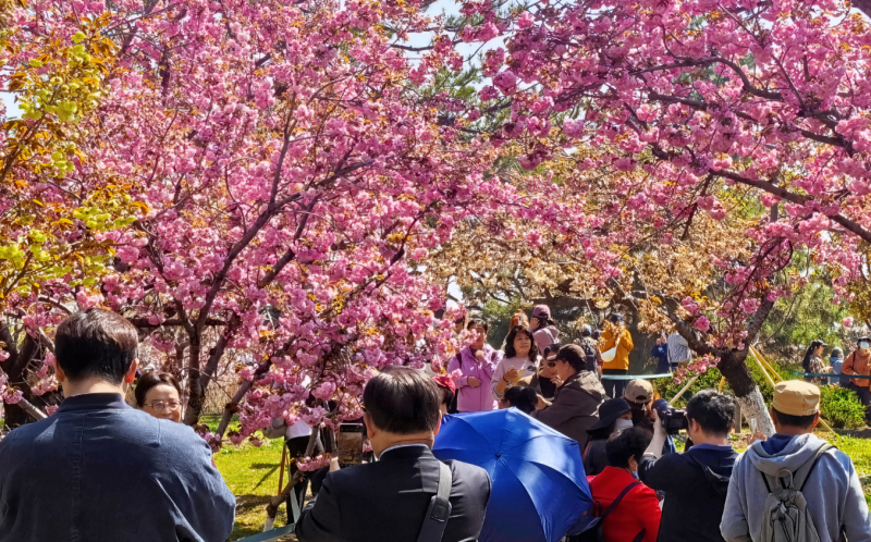 据玉渊潭公园高级工程师胡娜介绍,公园晚樱以关山、松月、普贤象等品种为主。与早樱单瓣、花朵小巧不同,晚樱为重瓣花朵,层层叠叠,近观如锦簇团花,远望似绯红云霞。除了常见的粉色、白色品种,园内还有黄绿色的郁金和须磨浦普贤象,清新脱俗,为繁花似锦的春日增添一抹别致色彩,晚樱的观赏期可持续至四月中下旬。