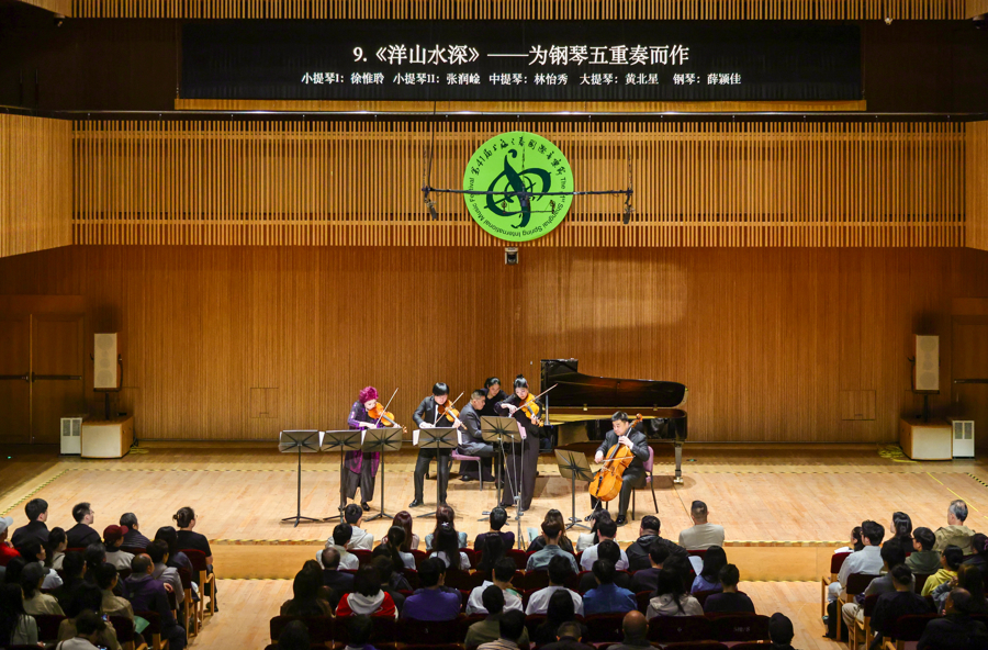 钢琴五重奏《洋山水深》聚焦新时代上海,以丰富的声部交织描绘国际大都市的蓬勃生机。在担任钢琴演奏的薛颖佳看来,这首作品虽然技巧难度高,却很有细节感与画面感,“在不同个性的音乐语汇中,能听到新时代上海的活力”。