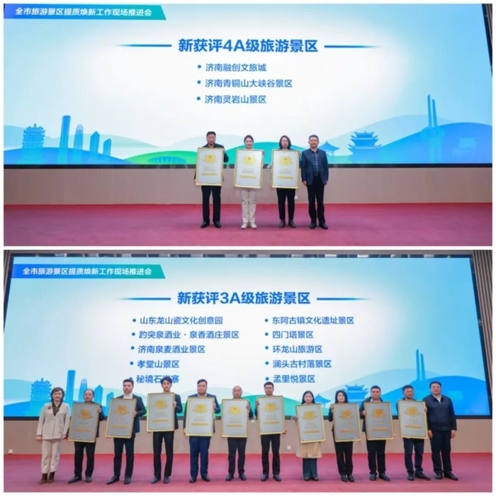 新获评4A级旅游景区包括:济南融创文旅城、济南青铜山大峡谷景区、济南灵岩山景区。