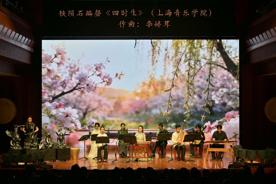 科技赋能传统文化是本场音乐会的亮点之一。舞台上,一件名为“万籁寂”的特殊乐器——陨铁编磬(由珍贵铁陨石打造而成),成为了全场焦点。它由上海音乐学院东方乐器博物馆与上海天文馆(上海科技馆分馆)、五云坊陨石工作室联合推出。在中国古代,金石之乐是最高规格的礼乐,而陨铁作为“天外来客”,更是连接天地的象征。由上音师生创作并演奏的民族室内乐作品《四时生》,巧妙地将陨铁编磬与二胡、扬琴、琵琶、古琴等传统民族乐器相融合。作品以春生、夏长、秋成、冬藏为线索,在长线条旋律的铺展中,让46亿年的宇宙回响与中华文明的礼乐传统展开了一场跨越时空的对话。这一创新实践是上音将“双一流”学科资源与前沿科技深度融合的成果,彰显了“科艺融合”的理念,拓宽了传统器乐的表现边界。