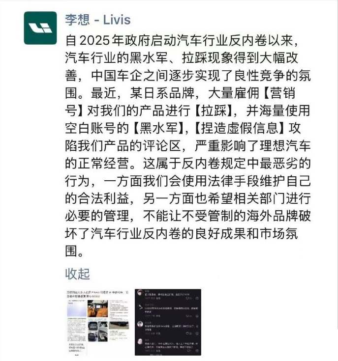 随后,李想又发文称:“最近,某日系品牌,大量雇佣【营销号】对我们的产品进行【拉踩】,并海量使用空白账号的【黑水军】,【捏造虚假信息】攻陷我们产品的评论区,严重影响了理想汽车的正常经营。”