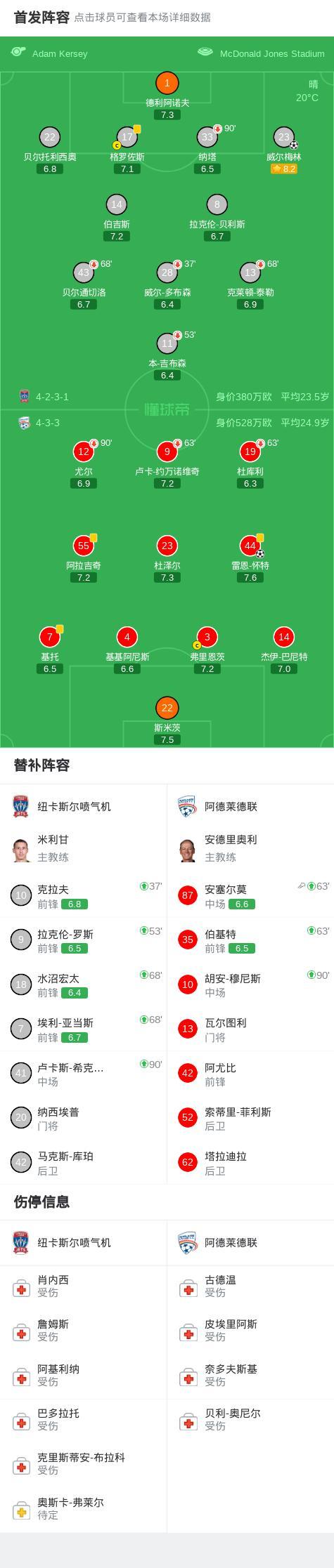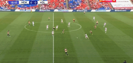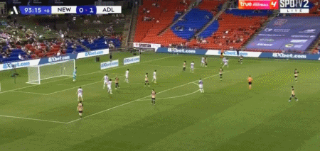 第90+4分钟,威尔梅林补射破门扳平比分,纽卡斯尔喷气机1-1阿德莱德联