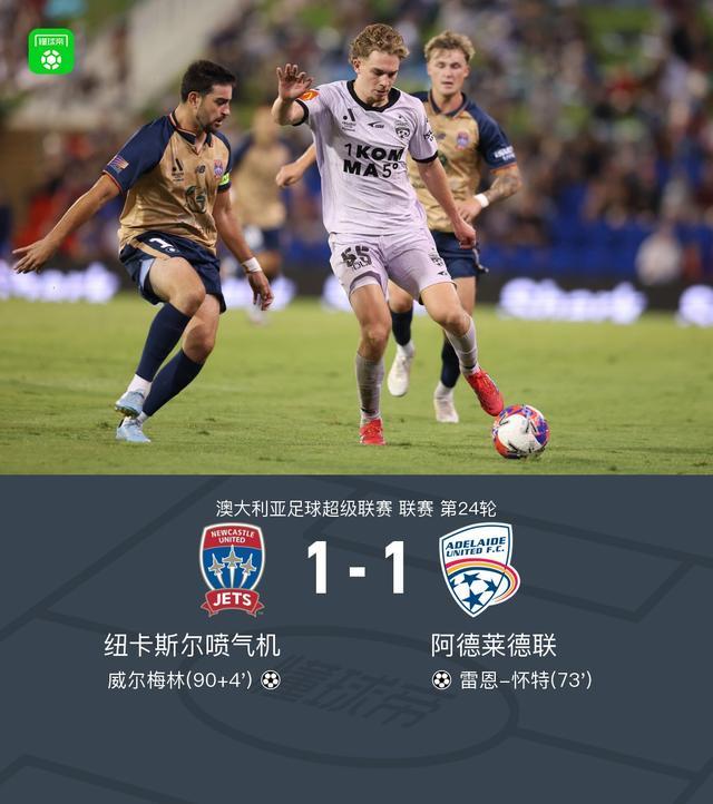 北京时间4月11日澳大利亚足球超级联赛第24轮,纽卡斯尔喷气机主场迎战阿德莱德联。比赛中,阿德莱德联球员安塞尔莫助攻雷恩-怀特打入一球;下半场补时阶段,纽卡斯尔喷气机球员威尔梅林打入一球。最终,纽卡斯尔喷气机1-1战平阿德莱德联。