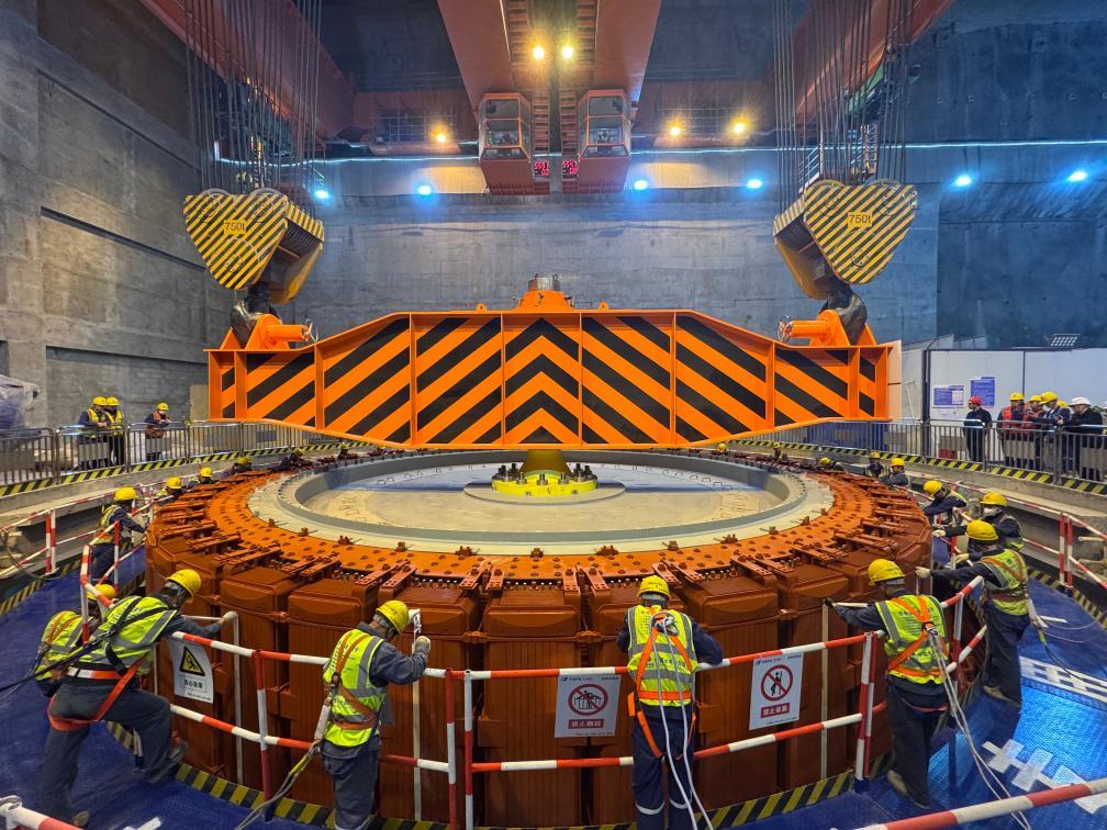 拉哇水电站首台机组转子成功吊入机坑。(华电金上拉哇分公司供图)