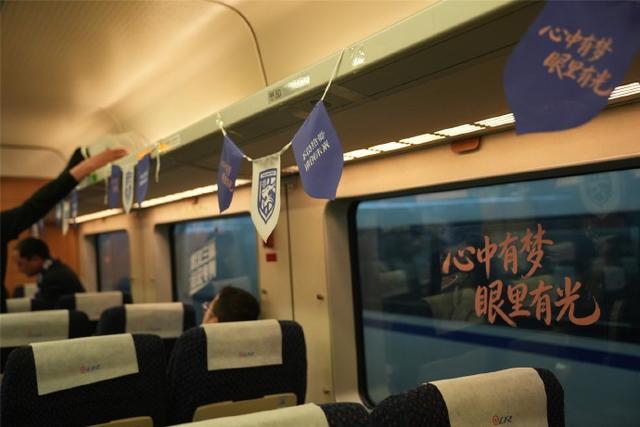车站为球迷朋友们开设了专属蓝色通道,车厢更是变成“移动主场”:窗贴、盾形吊旗、“心中有梦,眼里有光”的口号随列车一起出发,引得球迷们频频拍照打卡。