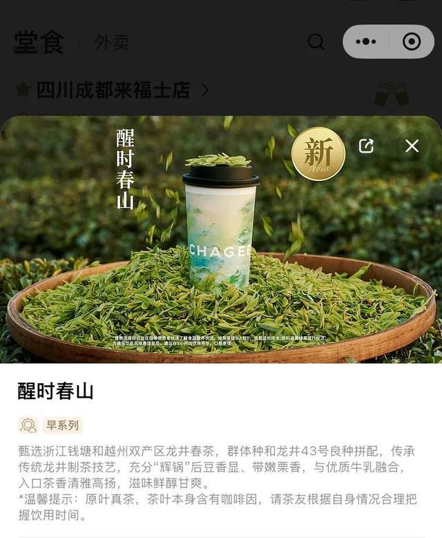 越越提到,她们家产的茶,被霸王茶姬的应季新品“醒时春山”用作茶底,甚至明确标注“钱塘龙井+越州龙井”,而非模糊的“绿茶”概念,产地属性更突显了。