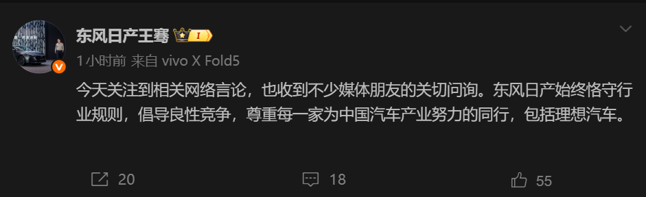 DoNews4月11日消息,4月11日,东风日产汽车销售有限公司新能源品牌总经理王骞在微博发文,回应理想CEO李想在朋友圈炮轰一事。