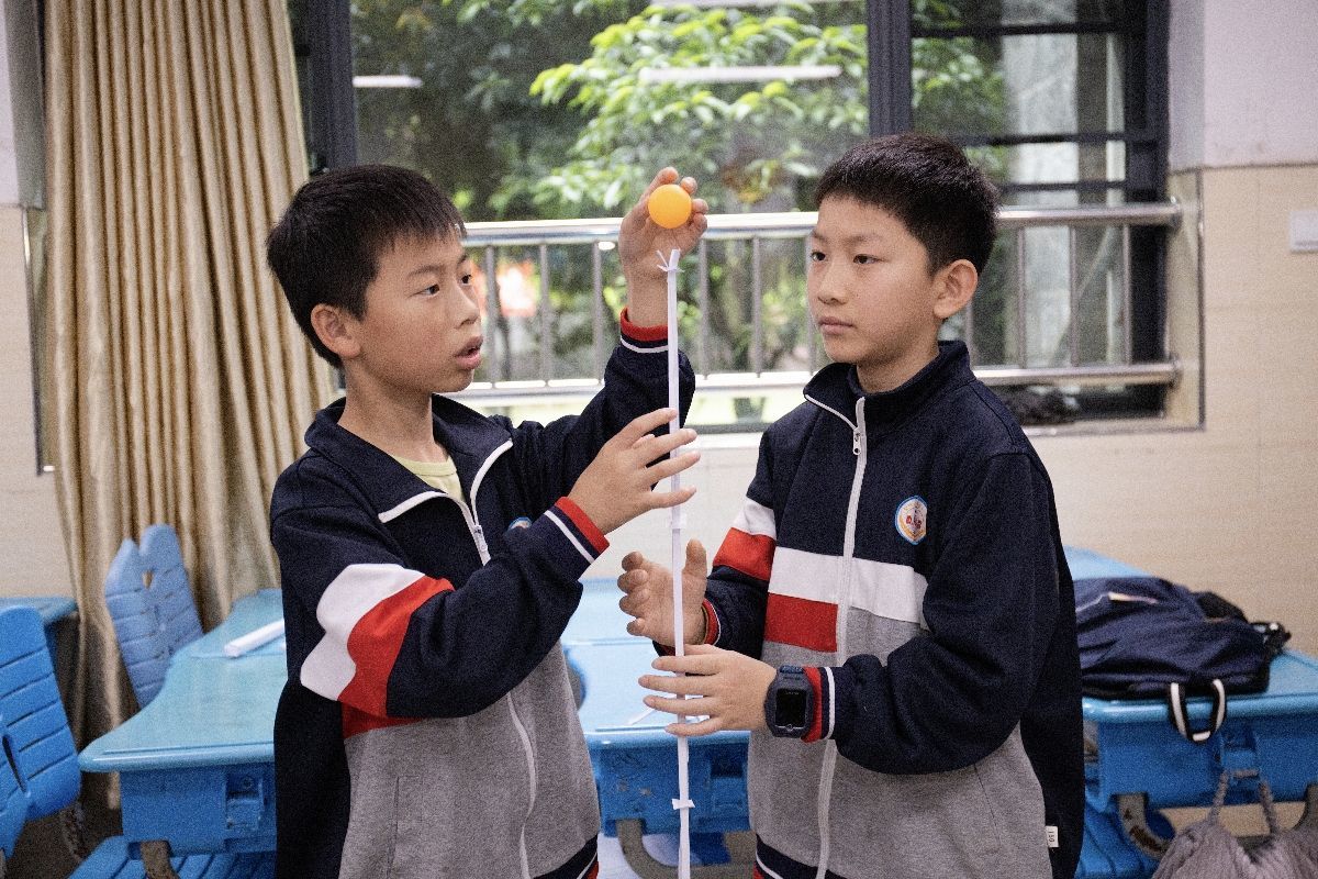 六年级同学们则需要用一张A4纸完成高塔争霸比赛,不仅比拼高,在最终测量时,“高塔”的顶端还要能放置一颗乒乓球并保持3秒。“106厘米!稳住了!”在高塔争霸比赛测量区域,来自新世博学校的杨子桓、徐梓豪开心庆祝。走出赛场,他们大方地表示,虽然这个高度可能不是最高,但在赛前的三次练习中,他们制作的“高塔”都因未能撑起乒乓球而宣告失败,好在他们没有失去信心,而是在比赛中改进了底座,增大了底座面积,让整个“高塔”更稳固,这才有了评委老师报出成绩时他们默契的欢呼。