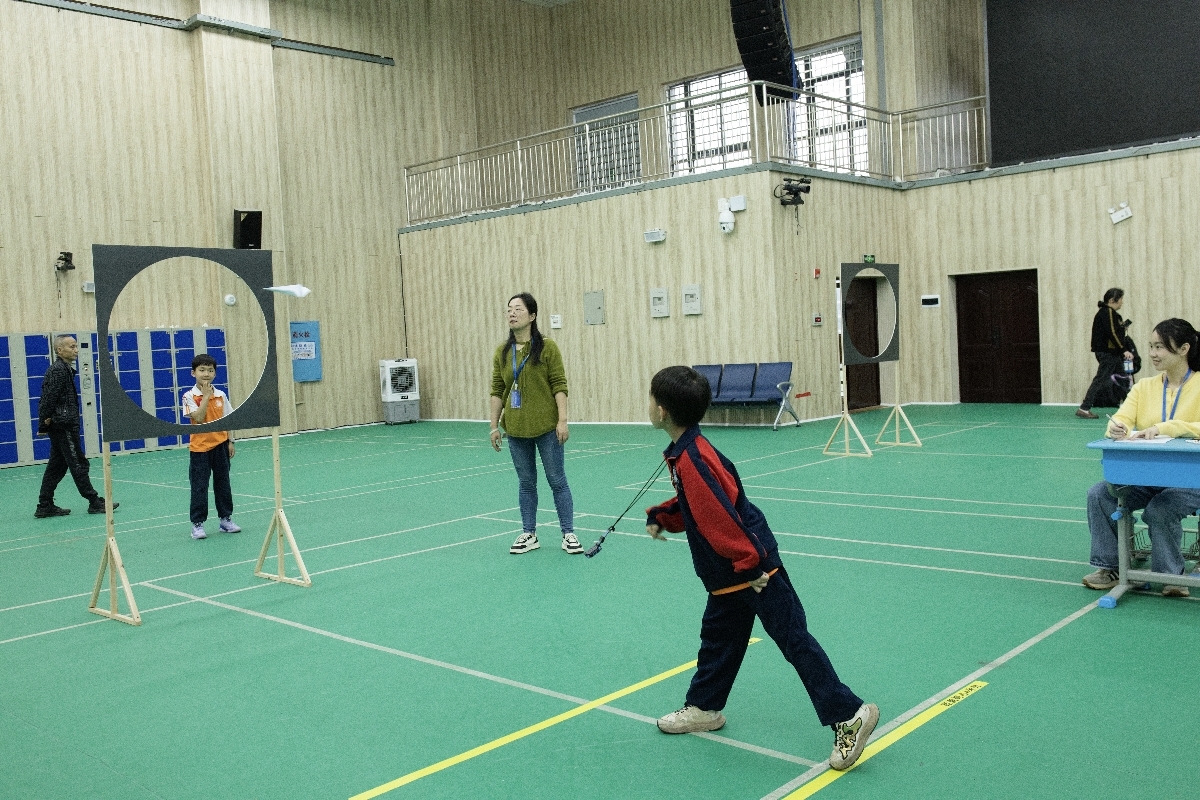 其中,一年级是纸飞机“打靶”比赛,萌娃们两人一组,先把A4纸折成纸飞机,然后投掷。当纸飞机稳稳地穿越指定圆圈时,小小“飞机制造者”们开心得跳了起来。