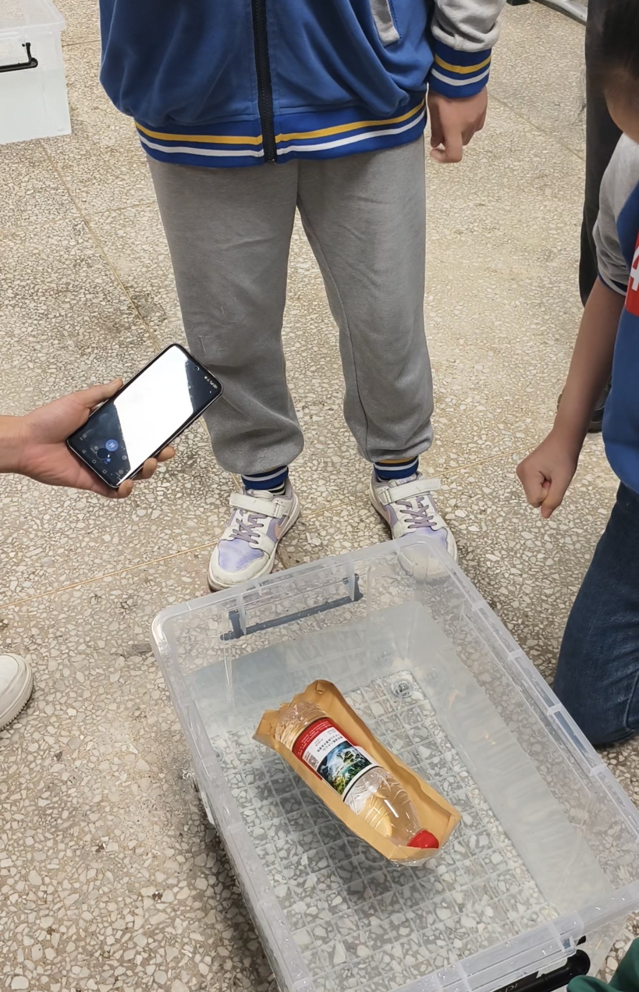同样需要承重一瓶矿泉水的,还有五年级的纸船承重比赛。选手们做出的造型各异的小船要被放进一个大水箱,还要在“船”里放一瓶矿泉水,并至少能在水中承重20秒不掉不破。有参赛女生拿着自己做的小纸船,小心翼翼地放到水中,秉着呼吸紧盯评委老师手中的计时器。17秒、18秒、19秒、20秒!时间一到,大家来不及欢呼,待小心地取出纸船后,才与同伴快乐地击掌庆祝。