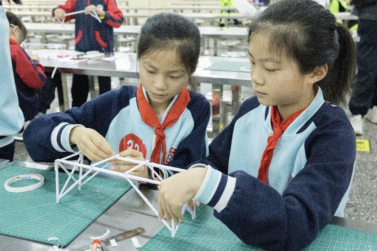 四年级的纸桥承重让同学们纷纷化身为“桥梁建造师”,每组两位参赛选手可以拿到5张A4纸,同学们用尺子仔细测量、规划,只为确保做出的纸桥能承重一瓶矿泉水。