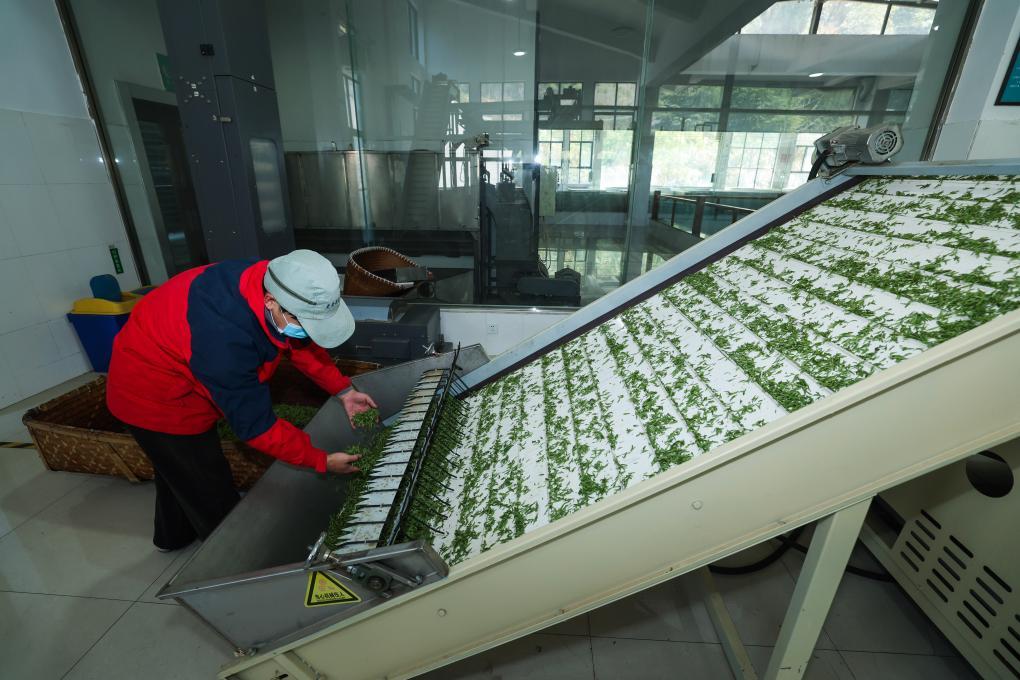 3月10日,在浙江省武义县更香有机茶业开发有限公司的生产车间内,自动化流水线正在加工首批春茶。新华社记者徐昱 摄