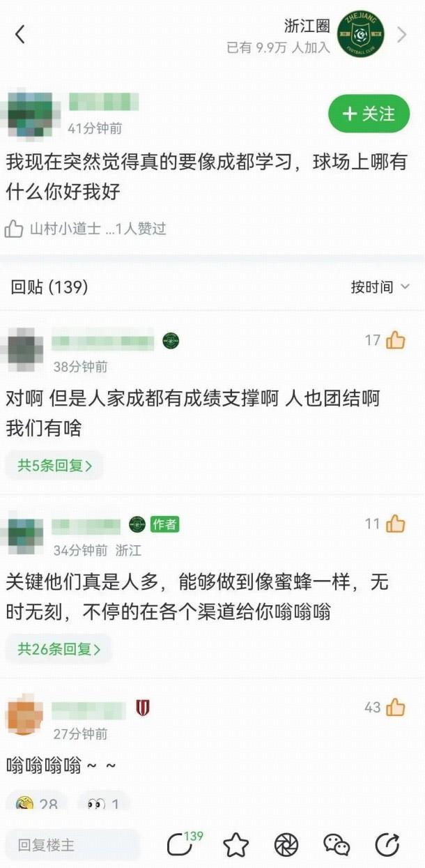 事情还得从我懂的一篇圈子内容说起,一名浙江球迷在圈子内发帖称:“我现在觉得真的要向成都学习,球场上哪有什么你好我好。关键他们真是人多,能够像蜜蜂一样,无时无刻,不停地在各个渠道给你嗡嗡嗡。”