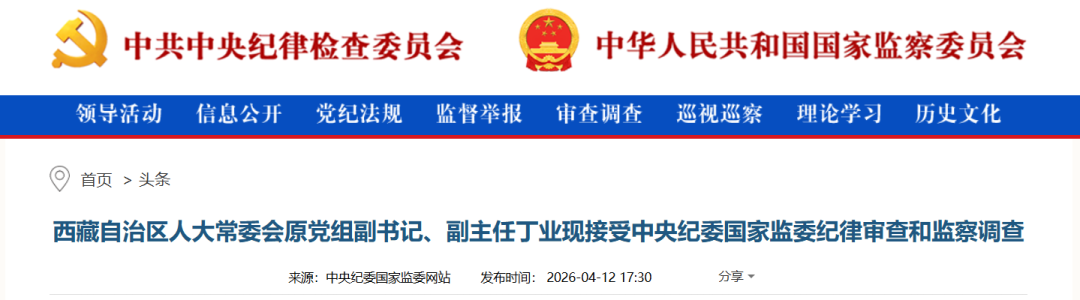 中央纪委国家监委网站4月12日消息,西藏自治区人大常委会原党组副书记、副主任丁业现涉嫌严重违纪违法,目前正接受中央纪委国家监委纪律审查和监察调查。